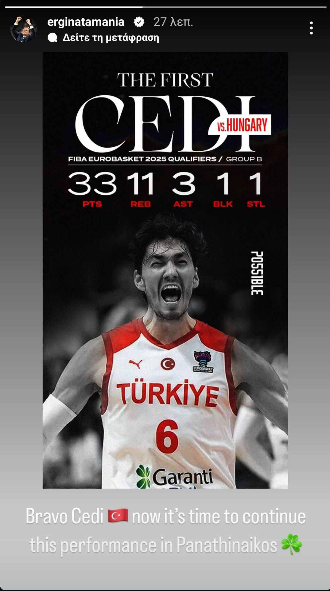 «Μπράβο Τσέντι, τώρα είναι ώρα να συνεχίσεις αυτή την απόδοση και στον Παναθηναϊκό», αναφέρει η ανάρτηση του Τούρκου εκλέκτορα, αλλά και προπονητή του Πααθηναϊκού, ο οποίος ζήτησε, με αυτόν τον τρόπο, από τον παίκτη του να συνεχίσει στον ίδιο ρυθμό και με την πράσινη φανέλα.