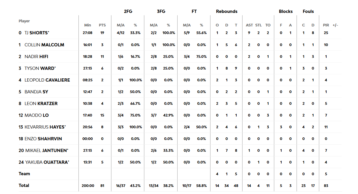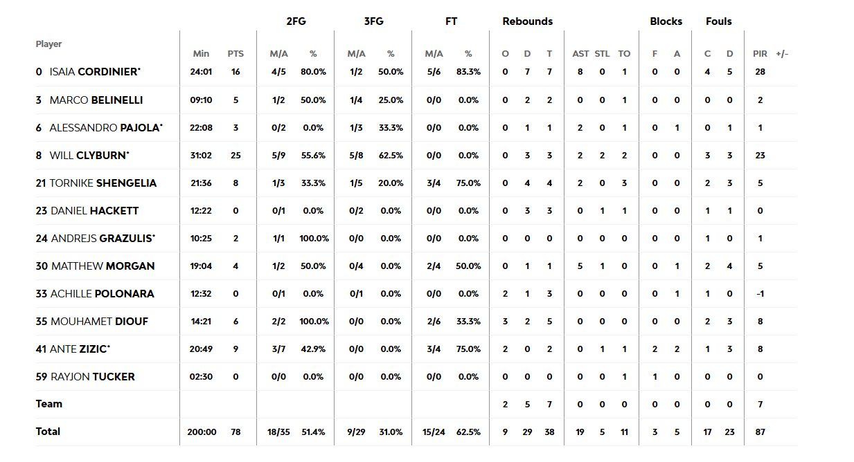 Διακριθέντες των γηπεδούχων ήταν ο Σορτς με 19 πόντους και 9 ασσίστ και ο Λο με 15 πόντους. Για την Βίρτους ξεχώρισε ο Κλάιμπερν με 25 πόντους και ο Κορτνινιέ με 16 πόντους, 7 ριμπάουντ και 8 ασσίστ.