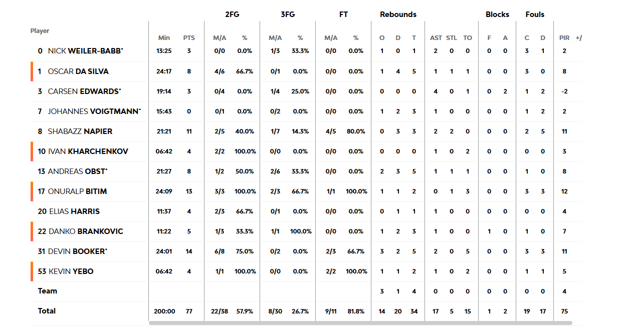 Πρωταγωνιστές των γηπεδούχων ήταν ο Πετσούσεβ με 25 πόντους και 5 ριμπάουντ με 34 στο σύστημα αξιολόγισης, όπως και οι Ντάουμ και Ντόμπριτς με 16 και 15 πόντους αντίστοιχα. Για τους φιλοξενούμενους ξεχώρισαν ο Μπούκερ με 14 πόντους και 5 ριμπάουντ και ο Μπιτίμ με 13 πόντους.