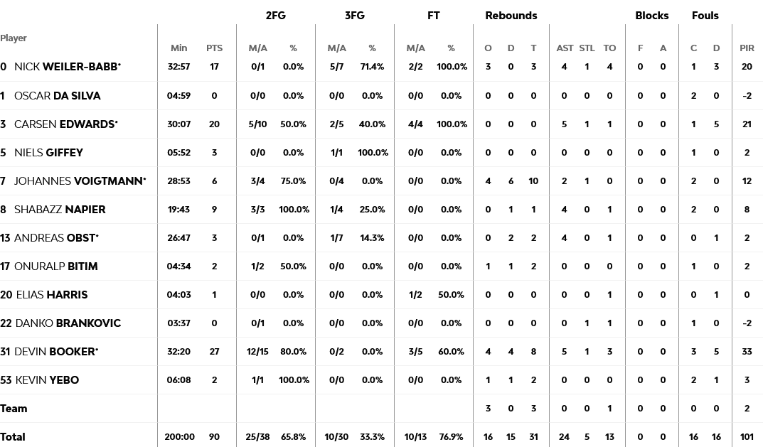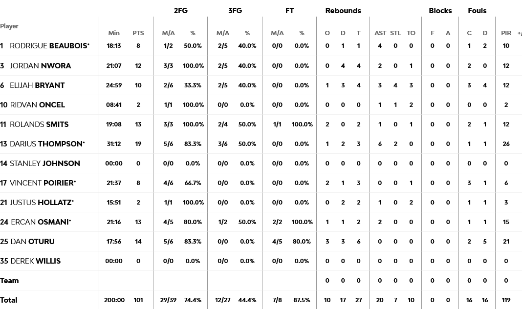 Ο Τόμπσον με 19 πόντους ήταν ο κορυφαίος των νικητών, με τον Οτούρου να έχει 14, ενώ για την Μπάγερν, Μπούκερ και Έντουαρντς είχαν 27 και 20 πόντους αντίστοιχα.