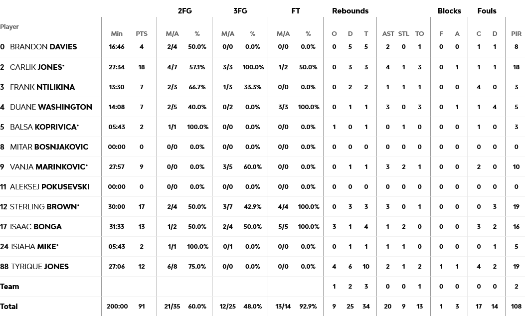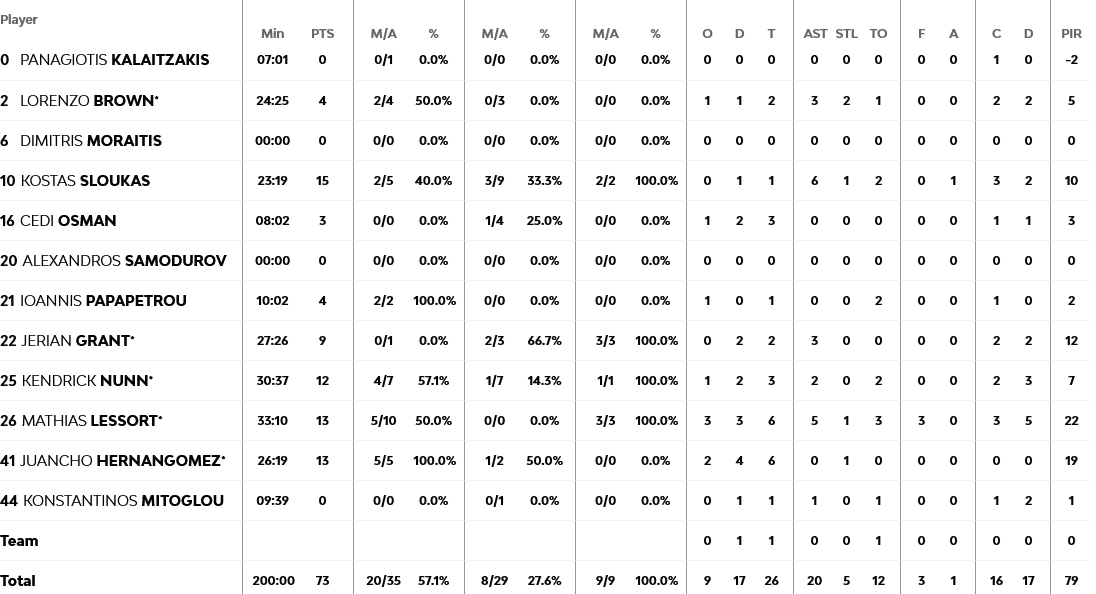 Ξεχώρισαν: 17 πόντους σημείωσε ο Μπράουν και 13 ο Μπονγκά, ενώ για τον Παναθηναϊκό, 15 πόντους είχε ο Σλούκας και από 13 οι Λεσόρ και Ερνανγκόμεθ.