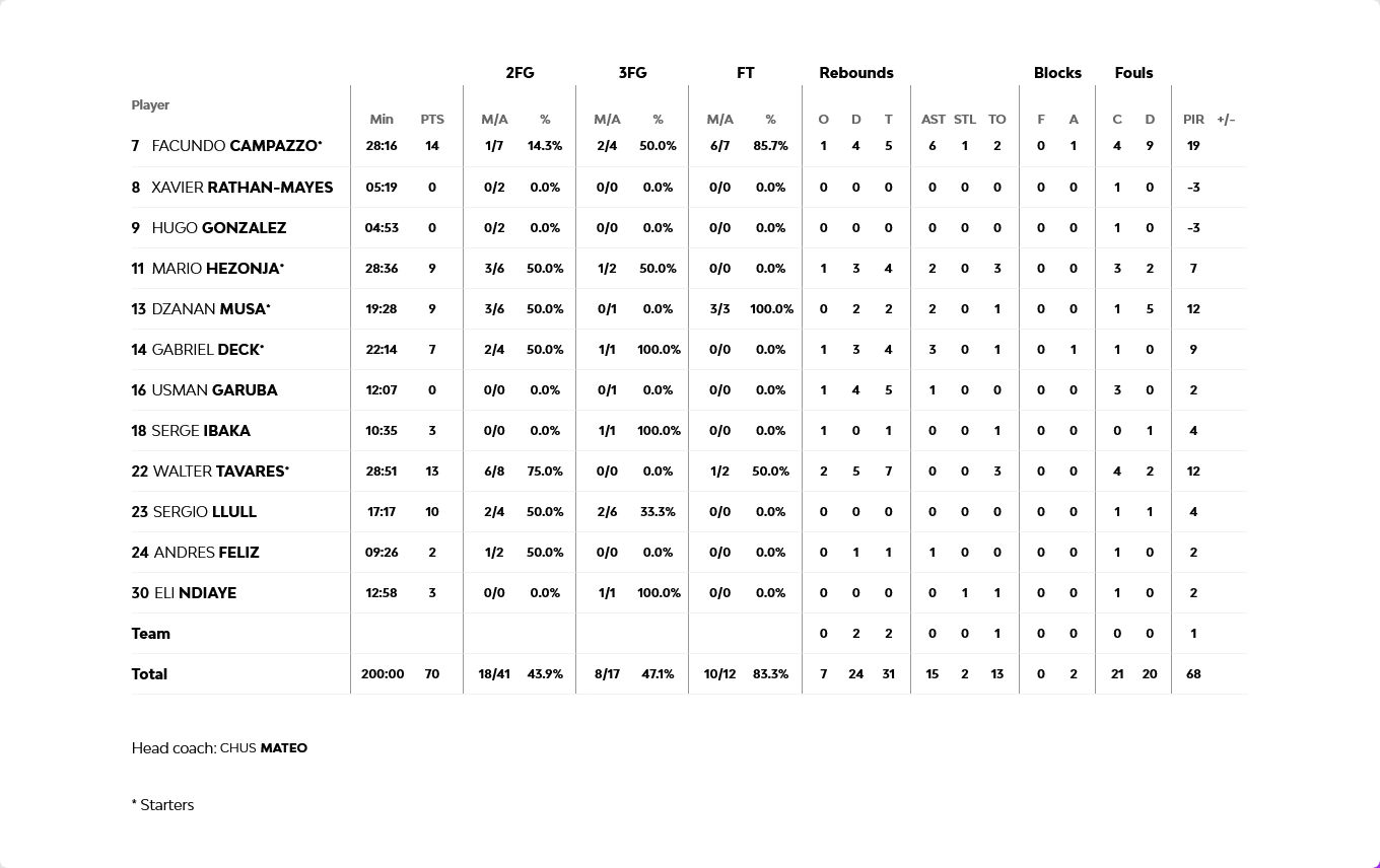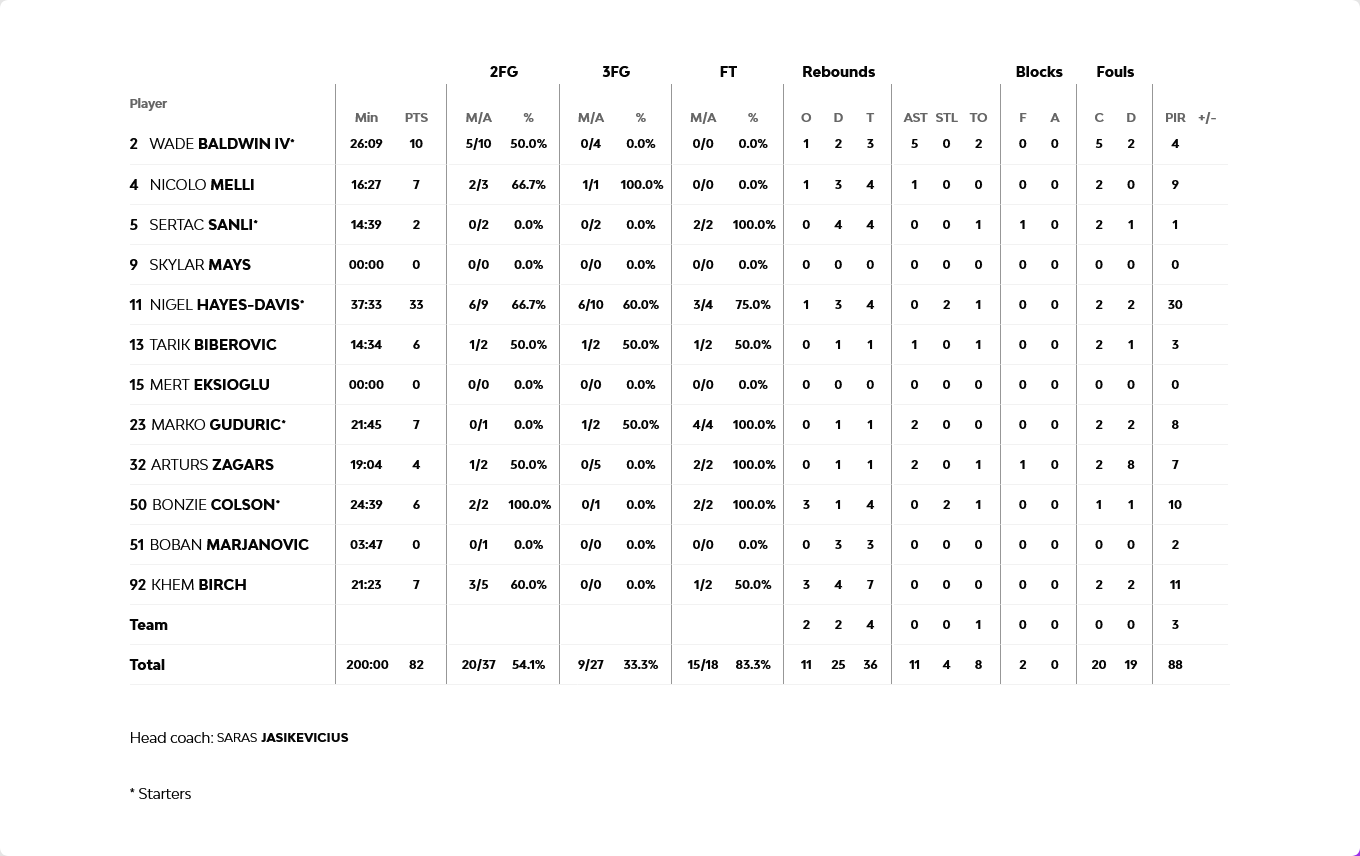 Για την Φενέρμπαχτσε καταπληκτικός ήταν ο Χέιζ-Ντέιβις με 33 πόντους και ακολούθησε ο Μπόλντγουιν με 10 πόντους, ενώ για την Βασίλισσα Καμπάτσο και Ταβάρες είχαν από 14 και 13 πόντους αντίστοιχα.