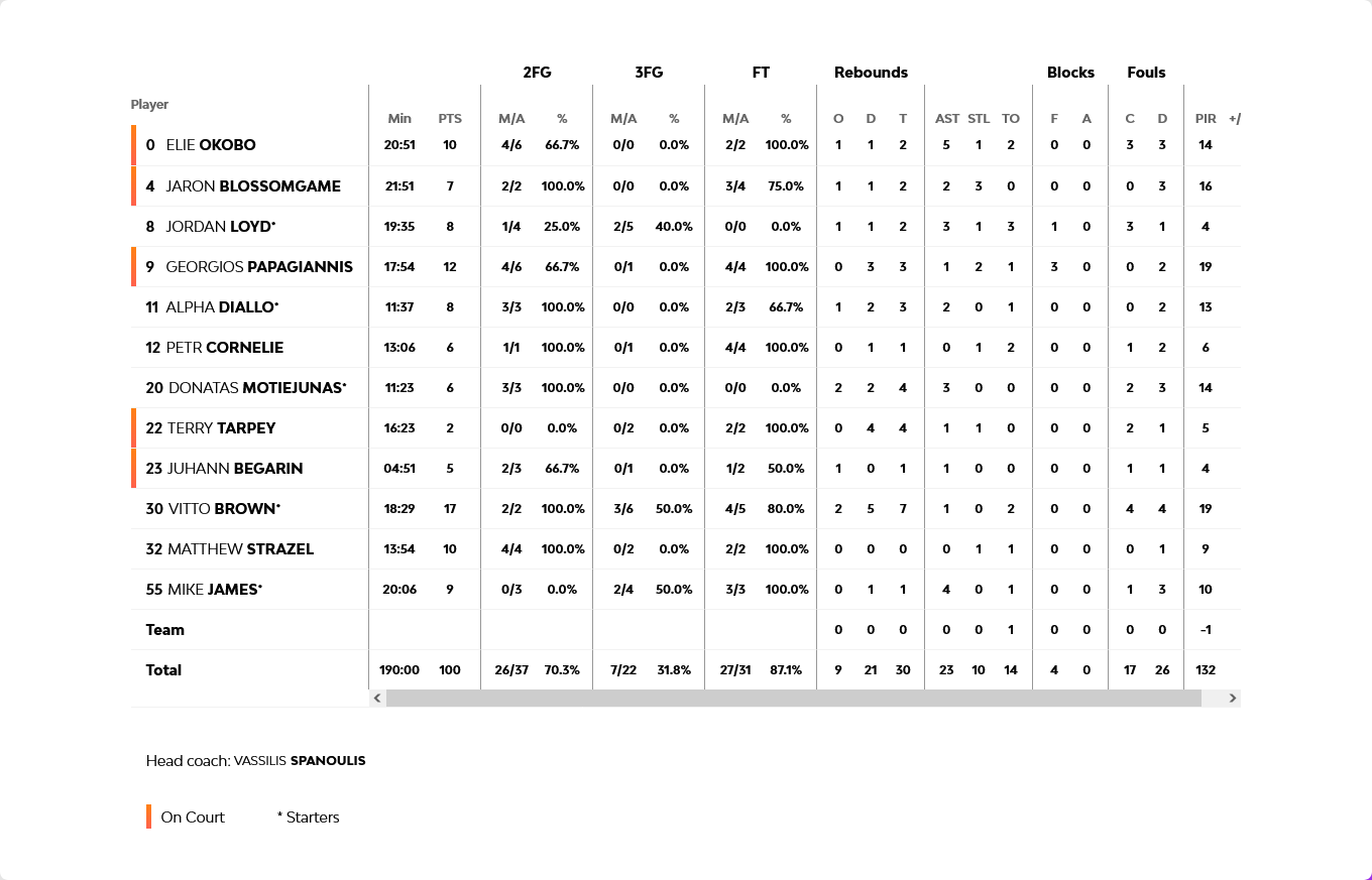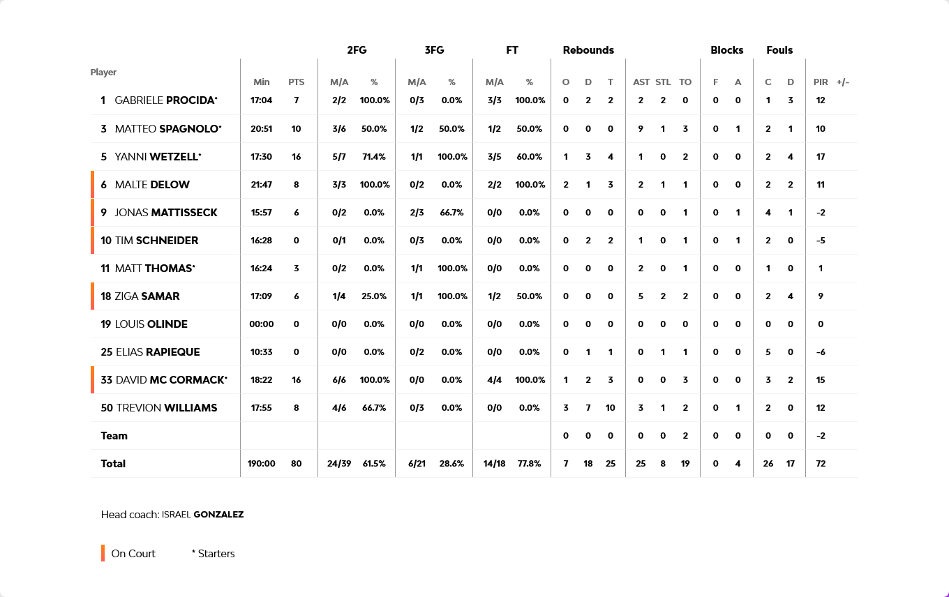 Κορυφαίος για τους νικητές ήταν ο Βίτο Μπράουν με 17 πόντους, με τον Παπαγιάννη να προσθέτει ακόμη 12. Από την Άλμπα ξεχώρισαν οι Γουέτζελ και ΜακΚ΄ορμακ με 16 έκαστος.