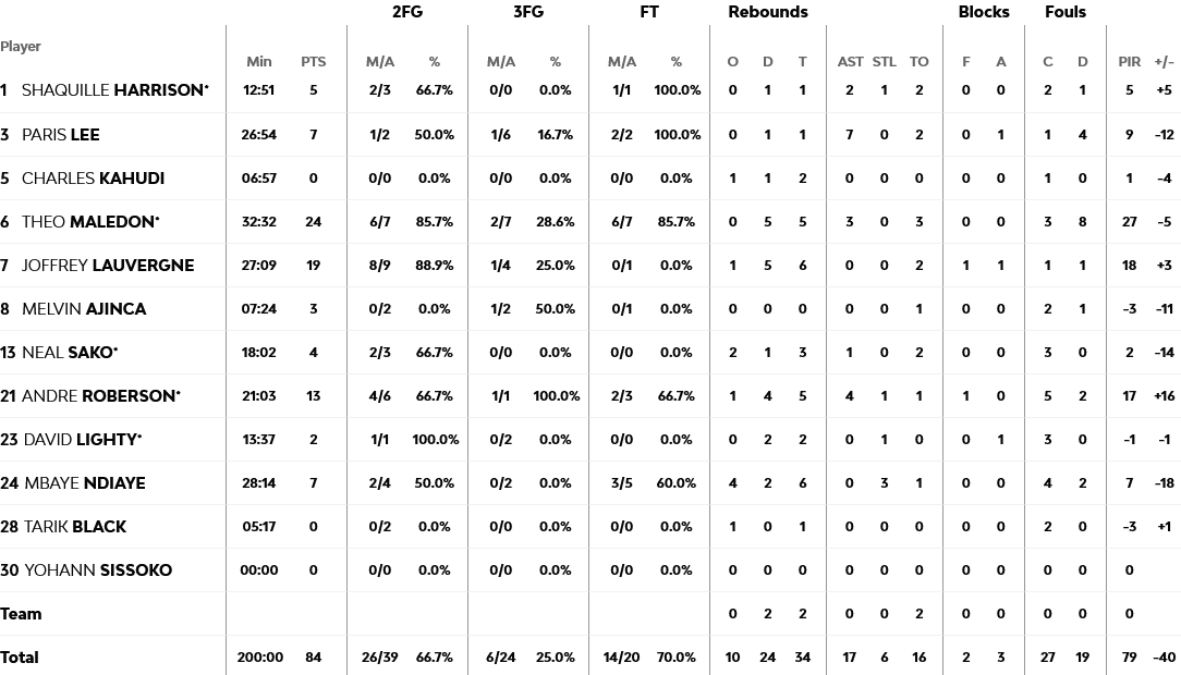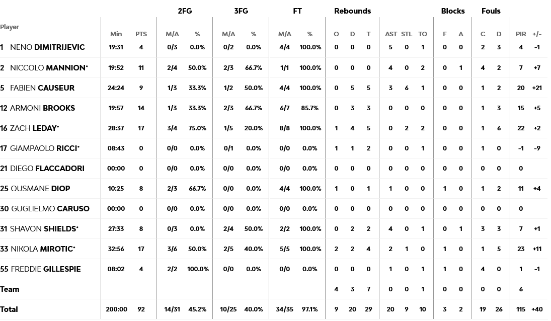 Για τους Ιταλούς ξεχώρισαν οι Μίροτιτς και Λέντει με 17 πόντους έκαστος, ενώ για την Βιλερμπάν ο Μα΄λεντόν είχε 24 πόντους και ακολούθησε ο Λοβέρν με 19 πόντους και 6 ριμπάουντ.