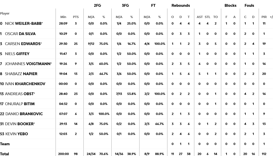 Για την Μπάγερν ξεχώρισαν οι Εντουάρντς με 25 πόντους και Ομπστ με 23. Για την Μακάμπι ο Χόουρντ είχε 25 πόντους και ο Ράντολφ 20.