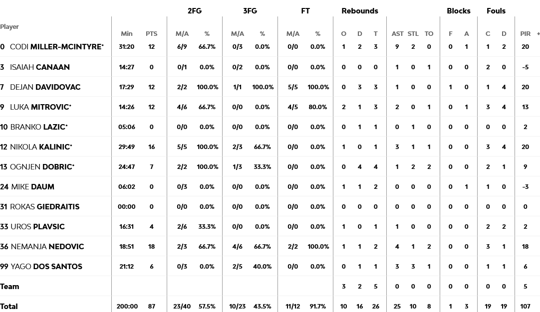 Ξεχώρισαν: 16 πόντους σημείωσε ο Κάλινιτς, ενώ από 12 είχαν οι Νταβιντόβατς, Μίτροβιτς και Μίλερ – Μάκινταϊρ, με τον τελευταίο να έχει και εννιά ασίστ. Για τον Ολυμπιακό, 19 πόντους και 10 ριμπάουντ είχε ο Βεζένκοβ και 11 ο Μιλουτίνοβ.