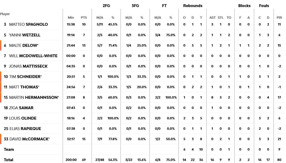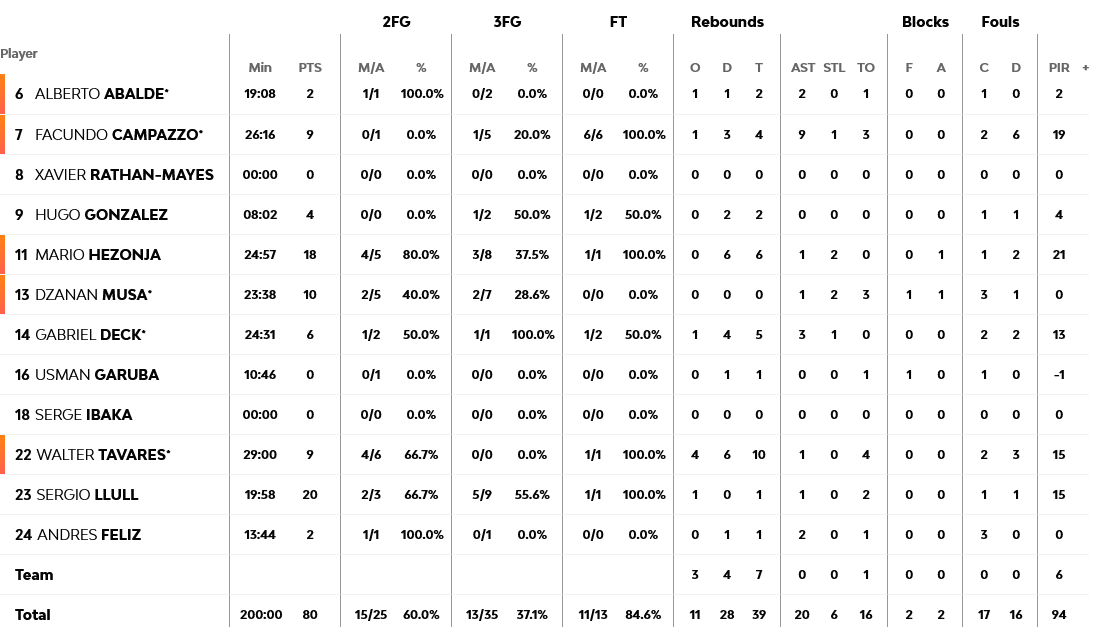 Εξαιρετικός ο Σέρχιο Γιουλ, που τελείωσε το παιχνίδι με 20 πόντους και 5/9 τρίποντα, με τον Χεζόνια να ακολουθεί με 18 πόντους και έξι ριμπάουντ. Για την Άλμπα, 15 πόντους και οκτώ ριμπάουντ είχε ο ΜακΚόρμακ.