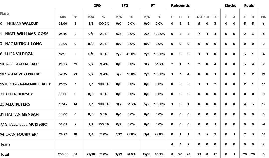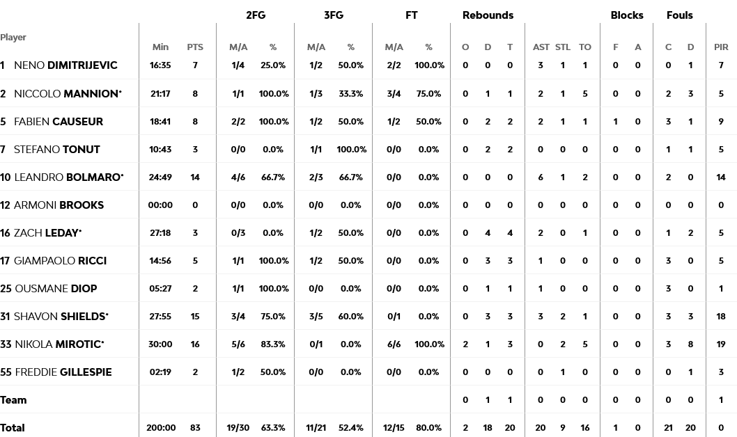 Ξεχώρισαν: Κορυφαίος της αναμέτρησης ο Φουρνιέ με 18 πόντους, επτά ασίστ και πέντε κλεψίματα, ενώ ο Πίτερς, με χέρι – αλφάδι στο φινάλε, τελείωσε το ματς με 14 πόντους. Για την Αρμάνι, που πήγε να… κλέψει το ματς στο φινάλε, ο Μίροτιτς είχε 16 πόντους και ο Σιλντς 15.