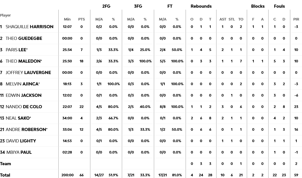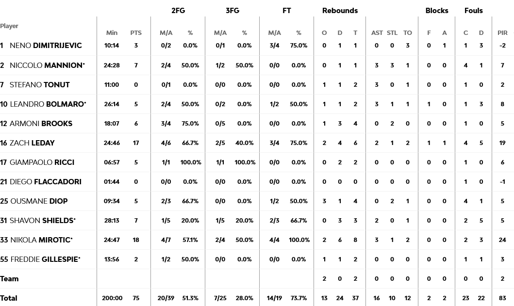 Για τους Ιταλούς ξεχώρισαν οι Λέντει με 17 πόντους και 6 ριμπάουντ και Μίροτιτς με 18 πόντους και 7 ριμπάουντ. Για την Βιλερμπάν ο Ντε Κολό είχε 22 πόντους και ο Μαλεντόν 18.