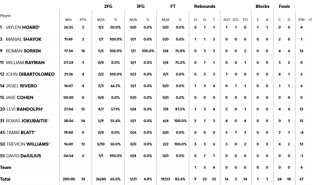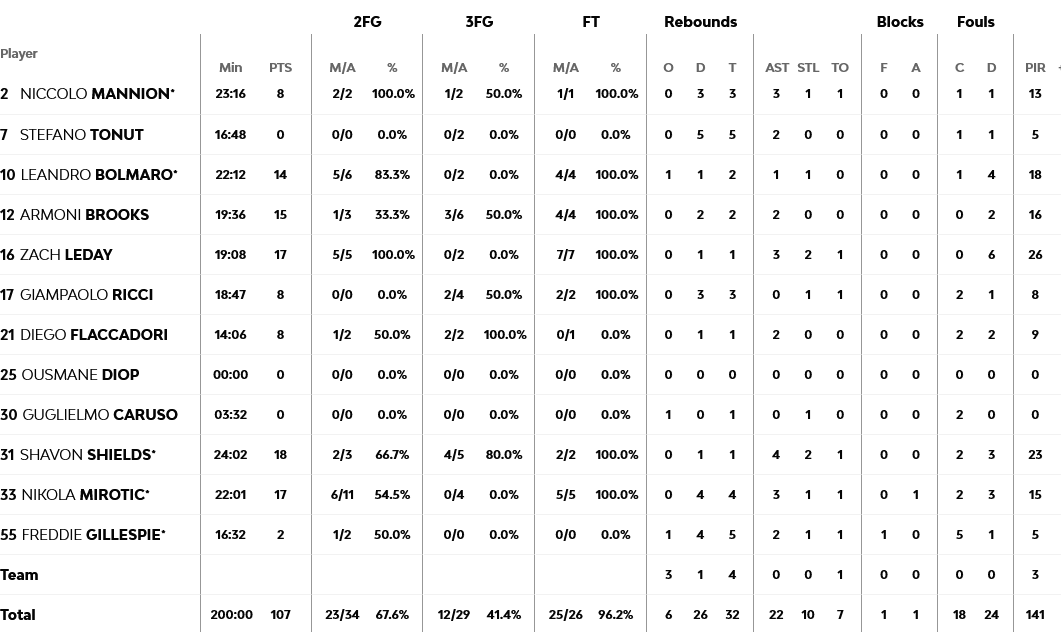 Για την Αρμάνι ξεχώρισαν οι Σιλντς με 18 πόντους και Μίροτιτς και Λέντει με 17 έκαστος. Για τους γηπεδο΄υχους ο Σόρκιν είχε 16 πόντους.
