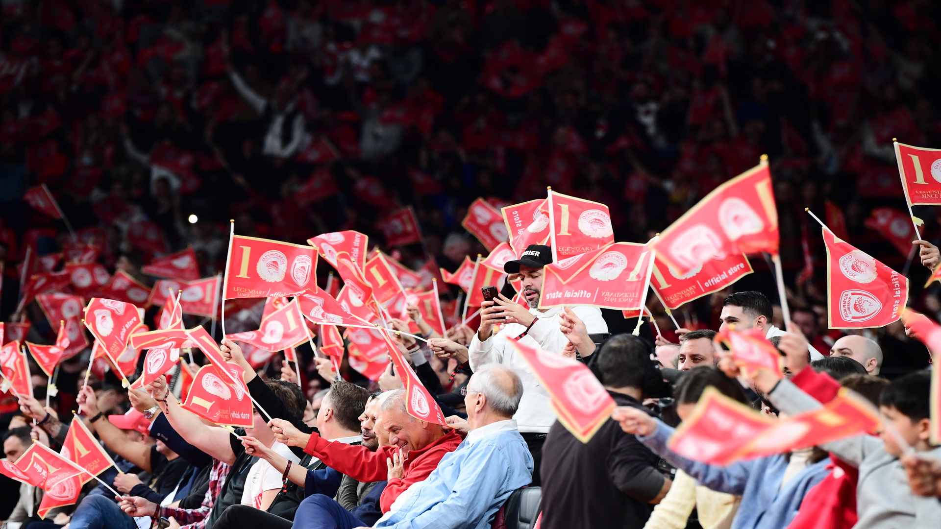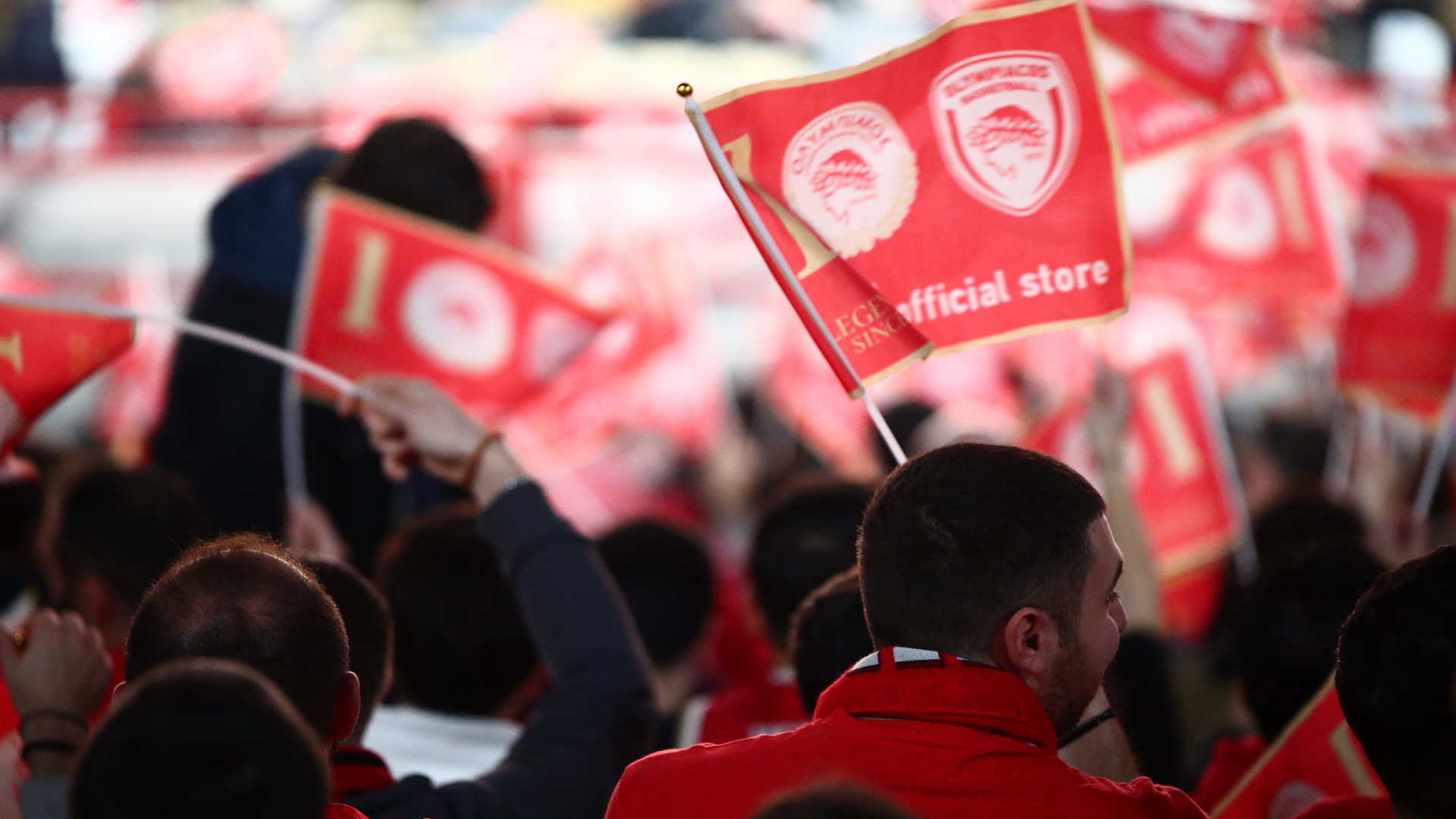 Εντυπωσιακή η ατμόσφαιρα στο Στάδιο Ειρήνης και Φιλίας από τους φίλους του Ολυμπιακού και στην δημιουργία του εξαιρετικού κλίματος, σημαντικό ρόλο έπαιξαν τα χιλιάδες σημαιάκια στις κερκίδες.