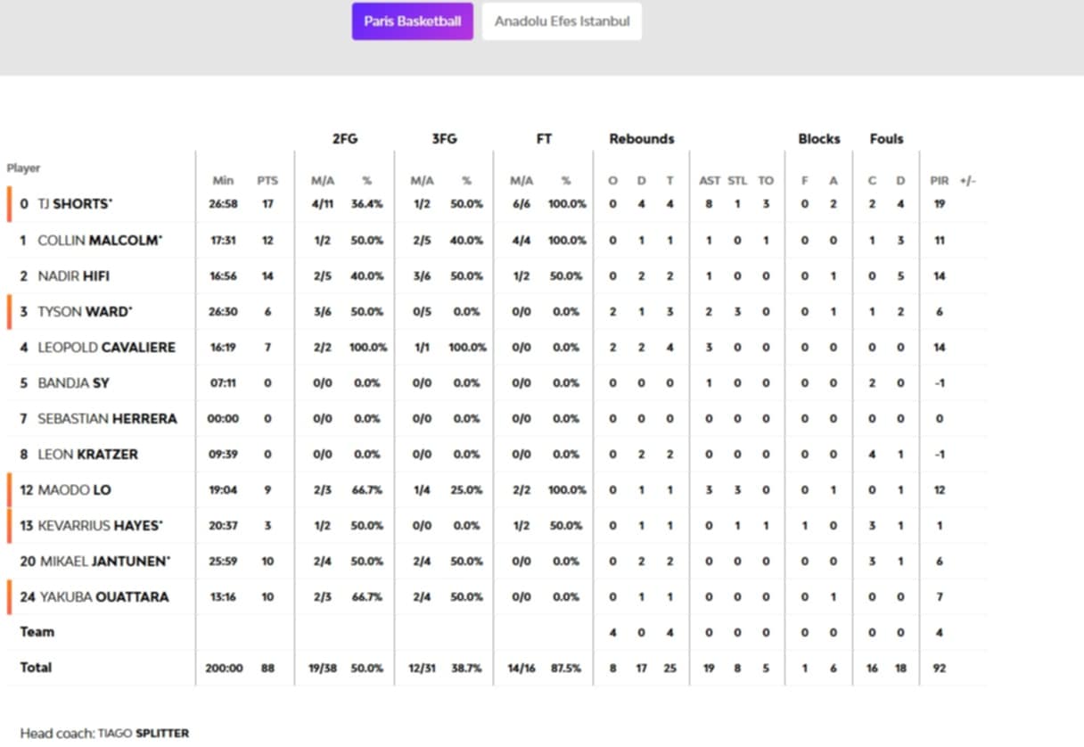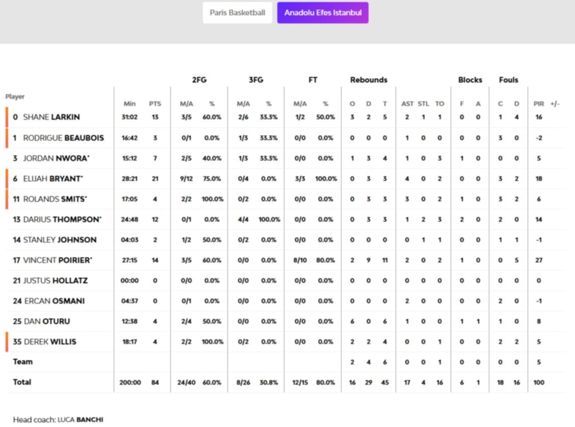 Από την Παρί διακρίθηκαν...οι κοντοί με τους Σόρτς και Χιφί να έχουν από 17 και 14 πόντους αντίστοιχα. Από την Εφές ξεχώρισε ο Μπράιαντ με 21 πόντους και ο Πουαριέ με double double, 14 πόντους, 11 ριμπάουντ και 2 ασίστ.