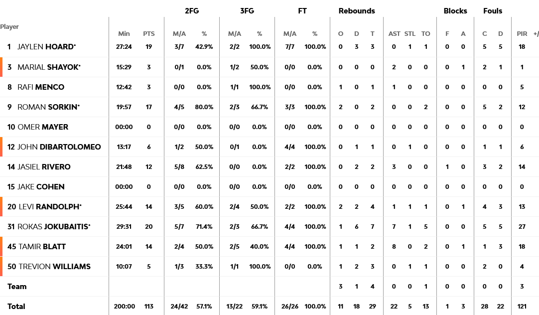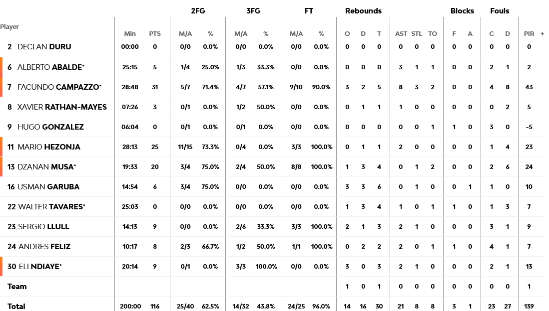 31 ΄πόντους, πέντε ριμπάουντ, οκτώ ασίστ, τρία κλεψίματα και 43 PiR είχε ο συγκλονιστικός Καμπάτσο, με τον Χεζόνια να έχει 25 πόντους και τον Μούσα 20. Για την Μακάμπι, των έξι διψήφιων παικτών, ο Γιοκουμπάιτις είχε 20 πόντους και ο Χόαρντ 19.