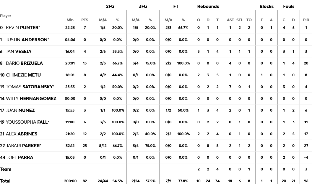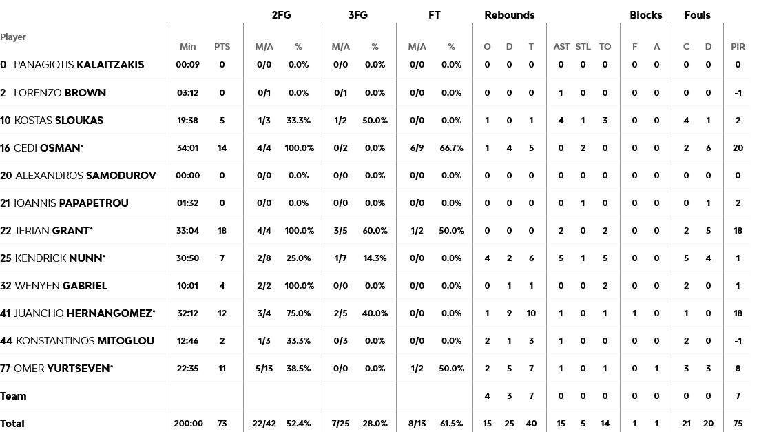 Ξεχώρισαν: 15 πόντους σημείωσε ο Μπριθουέλα και 12 ο Αμπρίνες. Για τον Παναθηναϊκό, που είδε τον Κέντρικ Ναν να μένει στους επτά πόντους, ο Γκραντ είχε 18 πόντους, ο Οσμάν 14, ενώ ο Χουάντσο έκανε double – double με 12 πόντους και 10 ριμπάουντ.