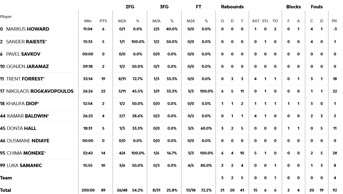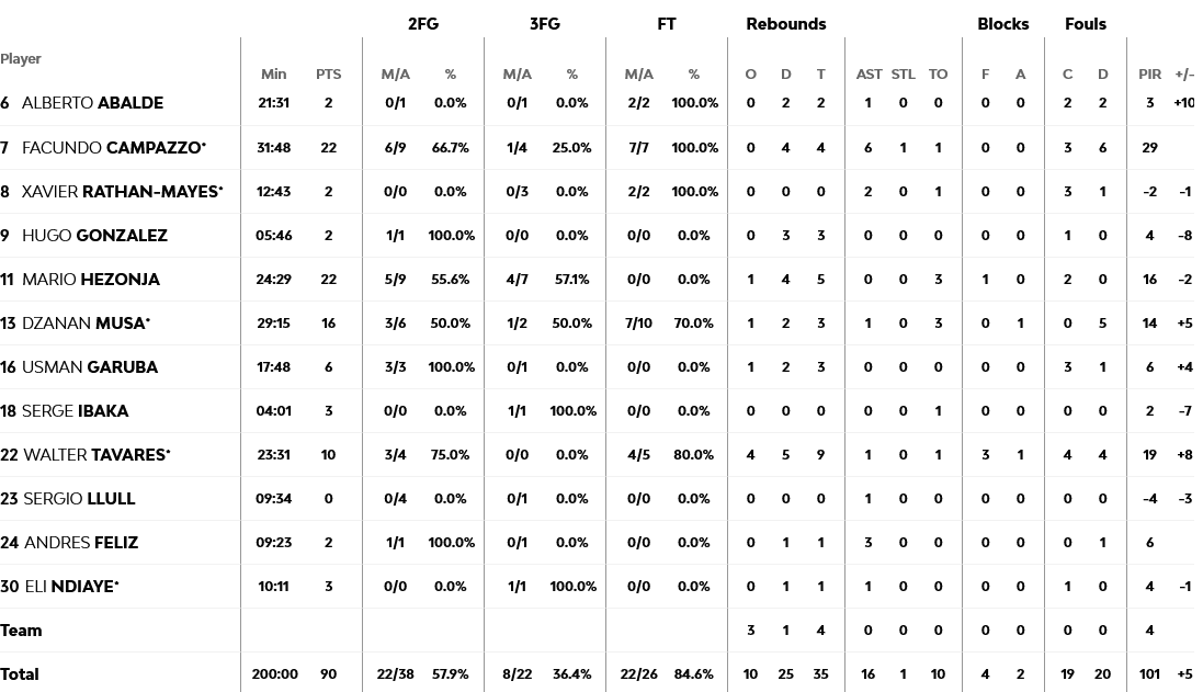 Για την Ρεάλ ξεχώρισαν οι Καμπάτσο και Χεζόνια με 22 πόντους έκαστος, ενώ για την Μπασκόνια ο Ρογκαβόπουλος είχε 22 πόντους με 11 ριμπαόυντ.