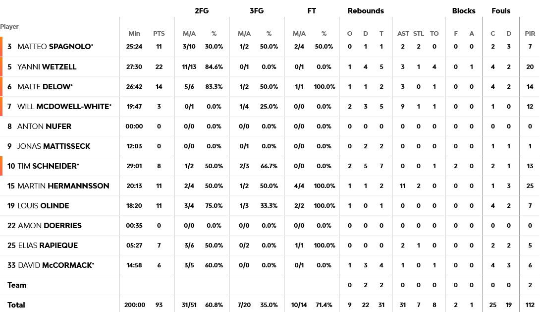 Από την Άλμπα Βερολίνου διακρίθηκαν οι Γουέτζελ και Ντελόου με 22 και 14 πόντους αντίστοιχα. Από την Μακάμπι Τελ Αβίβ ξεχώρισαν οι Μπλάτ και Σόρκιν με 16 και 14 πόντους.