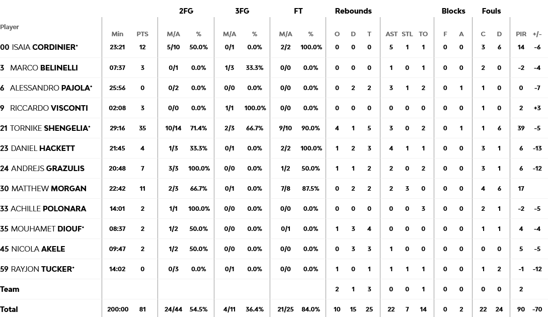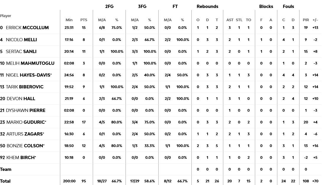 Για τους νικητές ξεχώρισαν οι Γκούντουριτς με 17 πόντους και ΜακΚόλουμ με 15, ενώ καταπληκτικός για την Βίρτους ήταν ο Σενγκέλια με 35 πόντους.