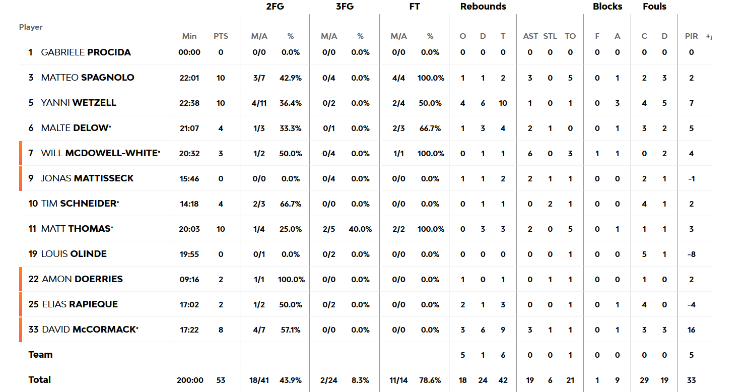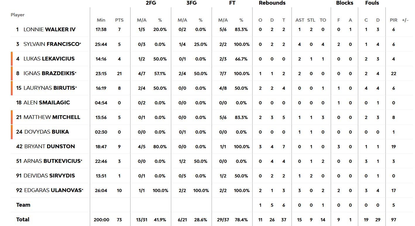 Από την Ζαλγκίρις ξεχώρισαν ο Μπραζντέικις με 21 πόντους και ο Ουλάνοβας με 10, ενώ από τους φιλοξενούμενους ο Σπανιόλο, Γουέτζελ και Τόμας με 10 πόντους έκαστος.