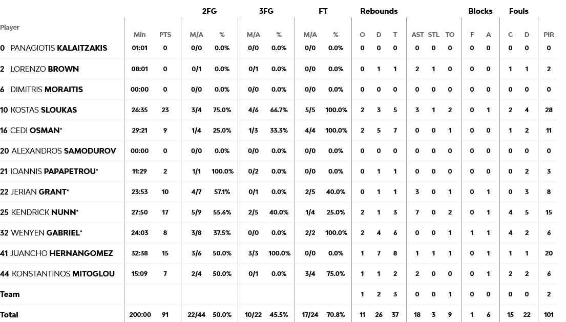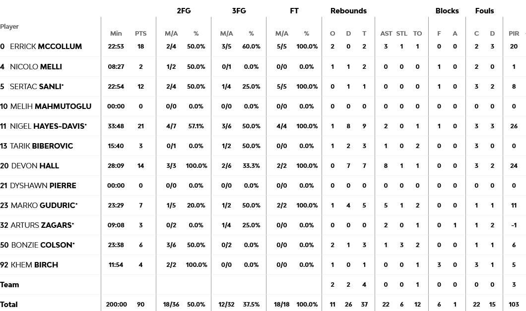 Ξεχώρισαν: 17 πόντους πέτυχε ο Ναν, τους 13 στην τελευταία περίοδο, με τον Χουάντσο να έχει 15. Για την Φενέρ, 21 πόντους και εννέα ριμπάουντ είχε ο… μοιραίος, με το airball και μετά φάουλ στο φινάλε, Χέιζ Ντέιβις, με τον ΜακΚόλουμ να ακολουθεί με 18.