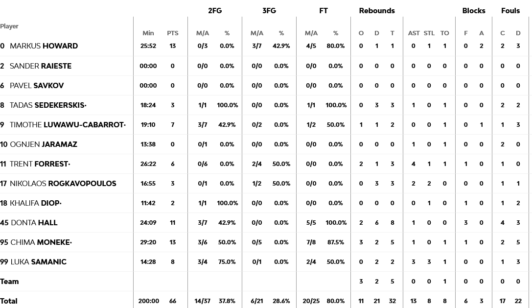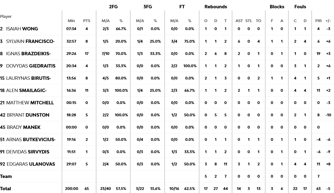 Από την Μπασκόνια διακρίθηκαν οι Χάουαρντ και Μονέκε με 13 πόντους έκαστος. Από την Ζαλγκίρις ξεχώρισαν οι Μπραζντέικις και Σμαιλάγκιτς με 17 και 11 πόντους αντίστοιχα.