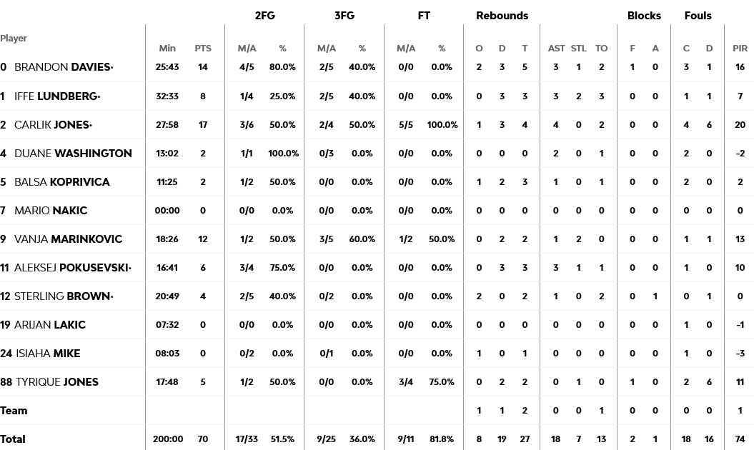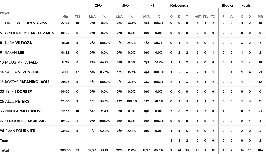 Ξεχώρισαν: Εξαιρετικός ο Μιλουτίνοβ με 10 πόντους και εννέα ριμπάουντ, ενώ 10 πόντους σημείωσε και ο Γκος. Για την Παρτιζάν, ο Καρλικ Τζόουνς είχε 17 πόντους, ο Ντέιβις 14 και ο Μαρίνκοβιτς 12.