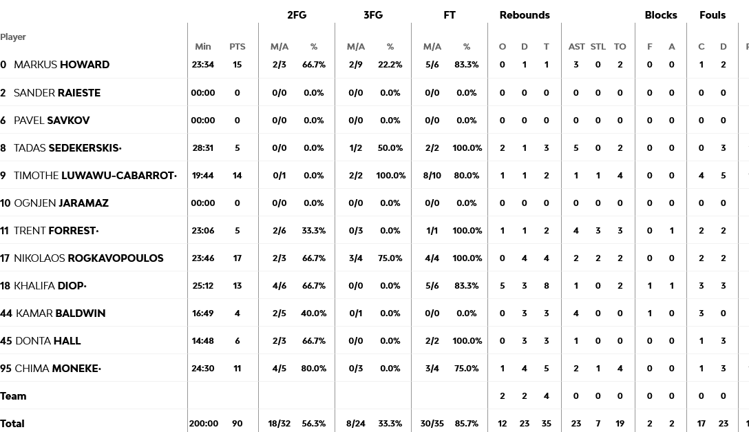 Εξαιρετικός ο Ματ Τόμας με 21 πόντους και 5/7 τρίποντα, με τους Χέρμανσον και Προσίντα να έχουν από 13 πόντους έκαστος, ενώ για την Μπασκόνια, ο Ρογκαβόπουλος ήταν ο πρώτος σκόρερ της ομάδας του με 17 πόντους, με τον Χάουαρντ να έχει 15.