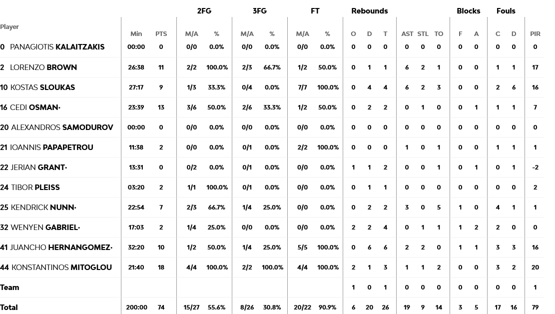 Ξεχώρισαν: Εξαιρετικός μέχρι την στιγμή του τραυματισμού του ο Γκος με 14 πόντους και τέσσερις ασίστ, ο Παπανικολάου είχε 11 πόντους και ο Φαλ 10 πόντους, πέντε ριμπάουντ και τέσσερις τάπες. Για τον Παναθηναϊκό, ο Μήτογλου ήταν απολαυστικός με 18 πόντους, με τον Οσμάν να ακολουθεί με 13 και τον Μπράουν να έχει 11 πόντους και έξι ασίστ.
