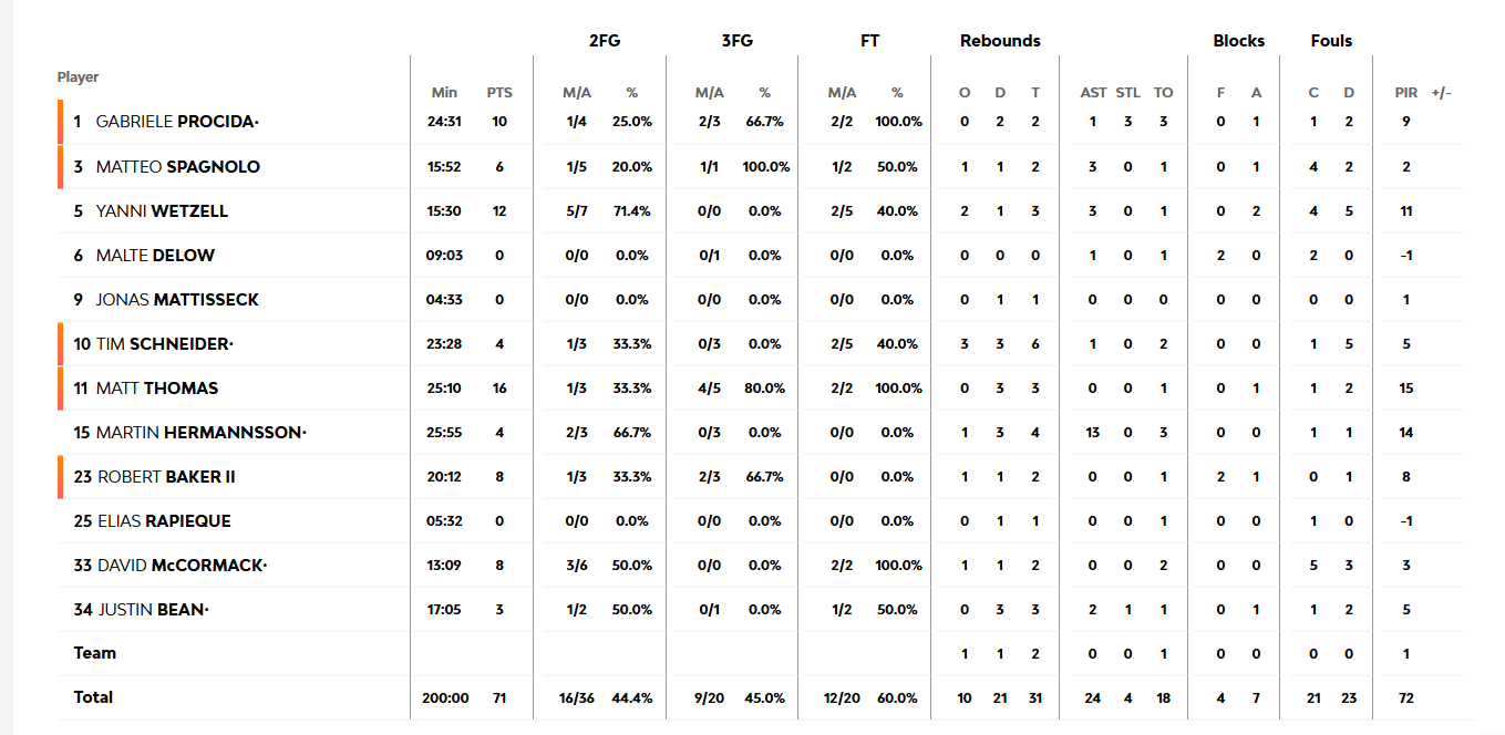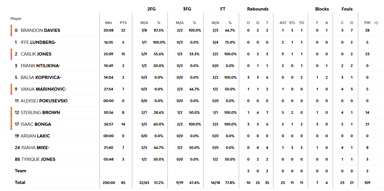 Κορυφαίος των γηπεδούχων ήταν ο Ντέιβις που σημέιωσε 22 πόντους. Από κοντά ο Κάρλικ Τζόουνς με 15 πόντους και 9 ασσίστ και ο Μπόνγκα με 14 πόντους και 6 ριμπάουντ. Από τους φιλοξενούμενους ο Μάτ Τόμας με 16 πόντους και ο Βέντζελ με 12 ήταν αυτοί που ξεχώρισαν.