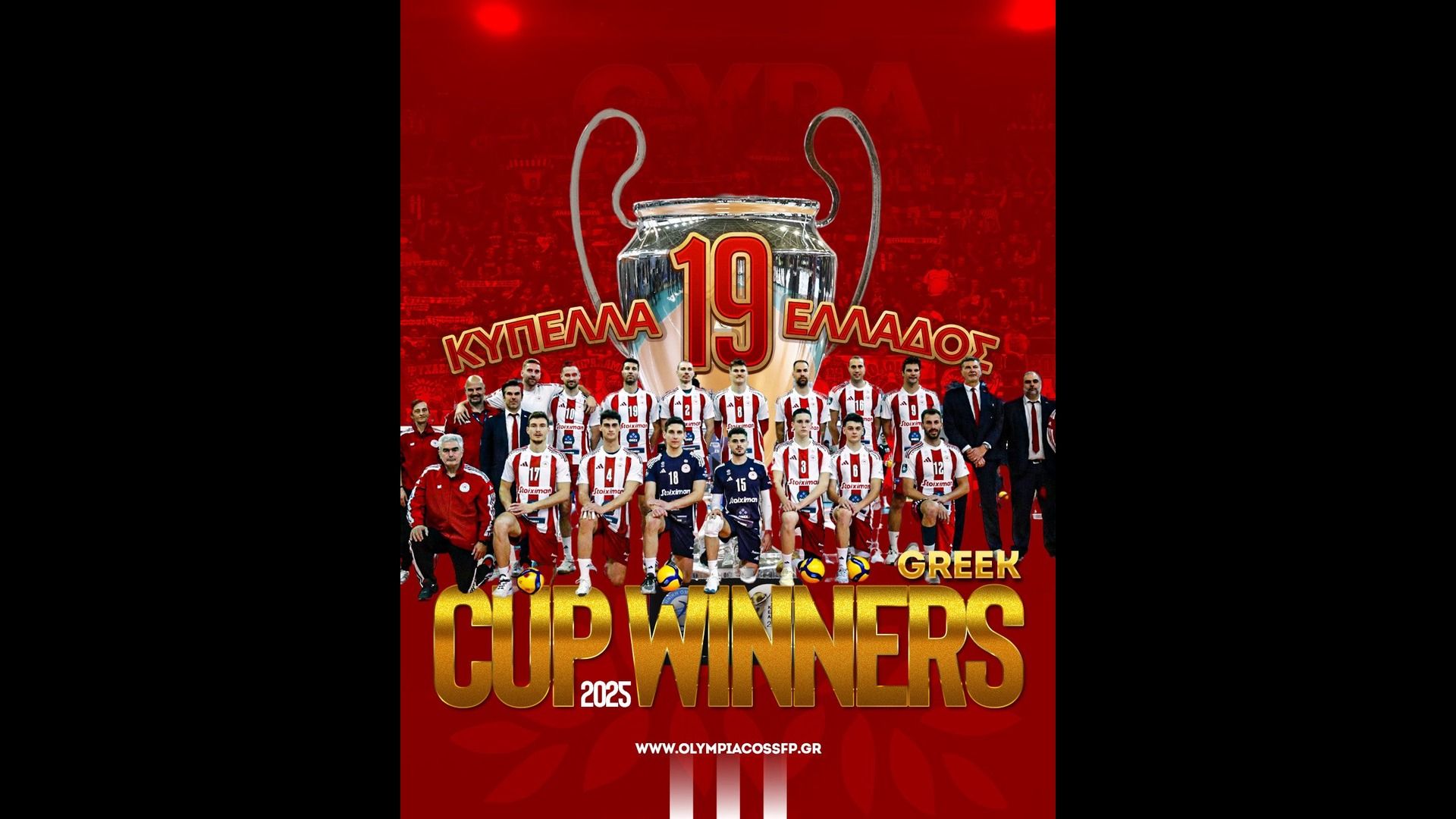 Τα συγχαρητήρια για την 19η κατάκτηση του ελληνικού Κυπέλλου βόλει στο τμήμα βόλει έδωσε ο μπασκετικός οργανισμός των ερυθρολεύκων.