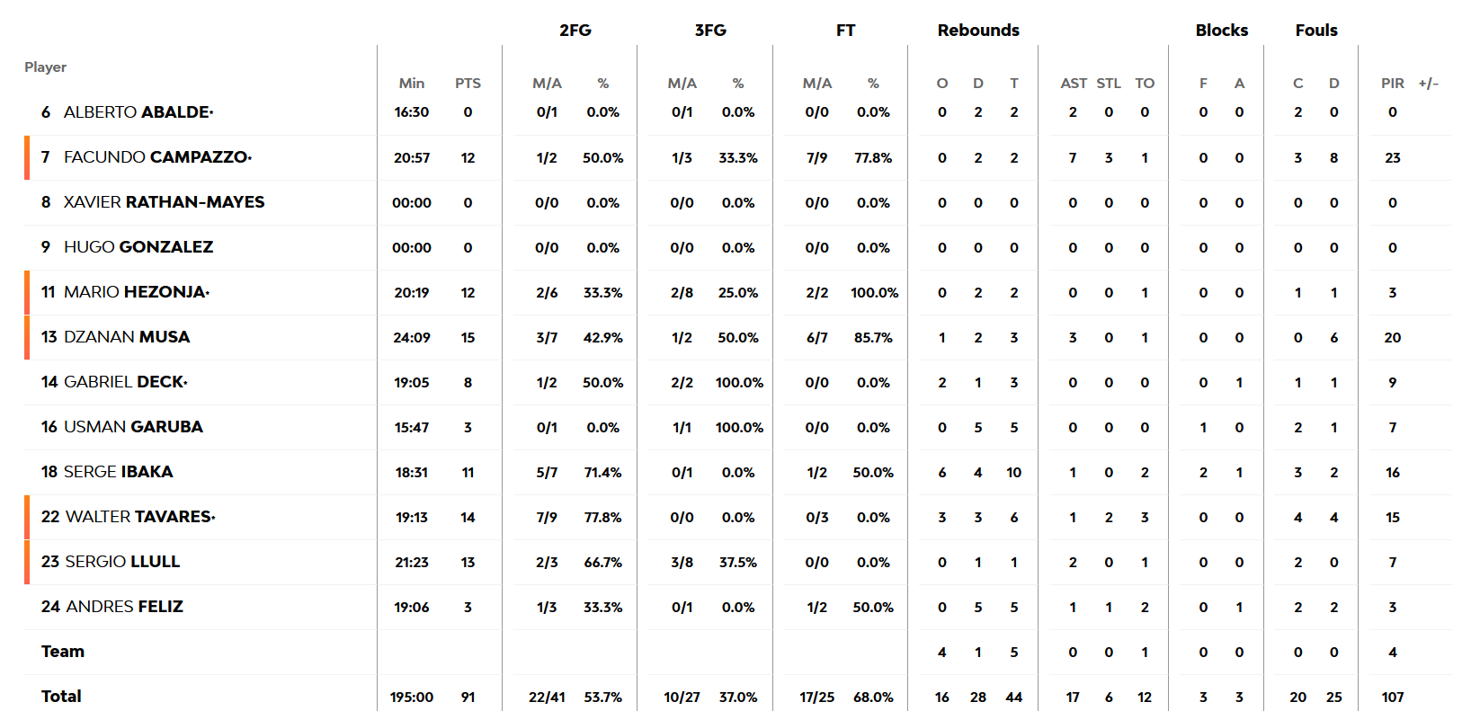 Από τους νικητές ξεχώρισε ο Ντζάναν Μούσα με 15 πόντους, ο Γουόλτερ Ταβάρες με 4 πόντους και 6 ριμπάουντ, καθώς και ο Ιμπάκα με 11 πόντους και 10 ριμπάουντ. Από την άλλη, πολύ καλή επίδοση από την Παρτιζάν σημείωσε ο Μπράντον Ντέιβις με 22 πόντους και ο Ιζαάκ Μπόνγκα με 14 πόντους και 11 ριμπάουντ.