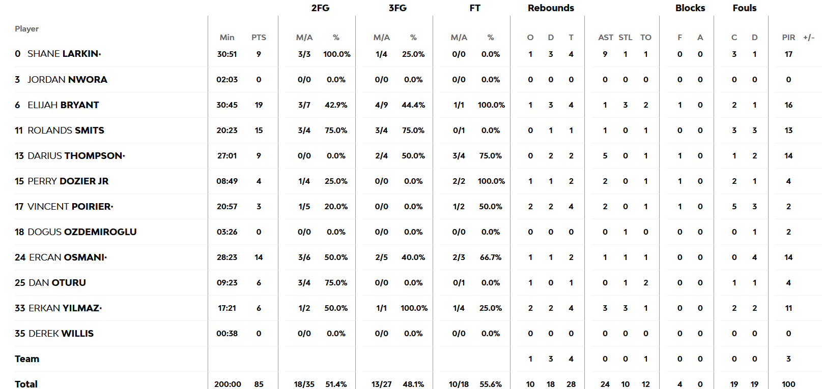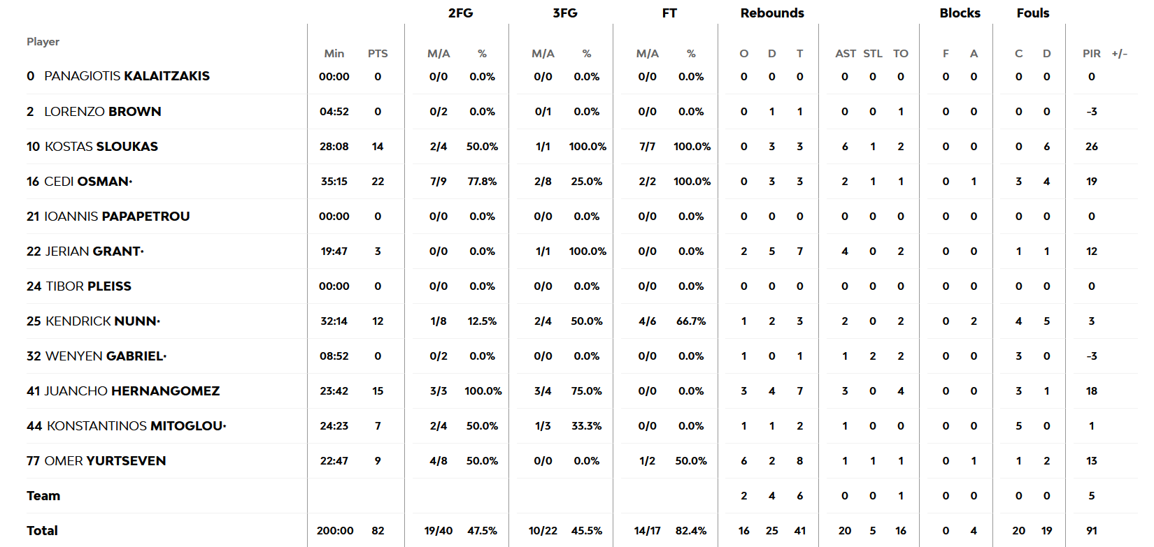 Ξεχώρισαν: Από τους «πράσινους» ο Ομέρ Γουιρτσεβέν με 9 πόντους και 8 ριμπάουντ, καθώς και ο Χουάντσο Ερνανγκόμεζ με 15 πόντους, 3/4 τρίποντα και 7 ριμπάουντ. Κορυφαίος των Τούρκων ο Ελάιτζα Μπάιαντ με 19 πόντους, ο Σέιν Λάρκιν με 9 πόντους και 9 ασίστ και ο Ερκάν Οσμάνι με 14 πόντους.