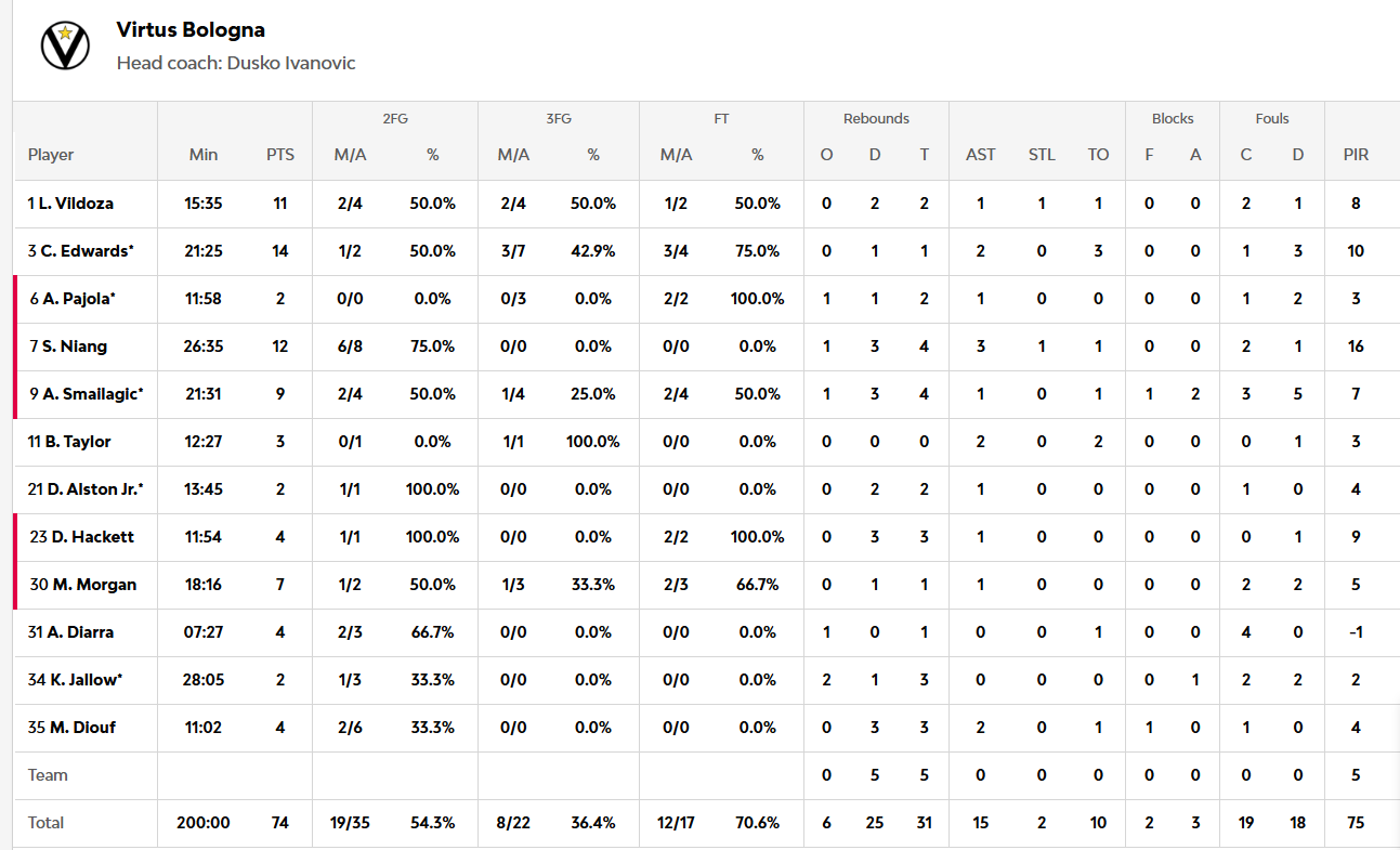 Οι γηπεδούχοι έπαιξαν καλή άμυνα απέναντι στην «βασίλισσα», η οποία ταλαιπωρήθηκε και από την επιθετική «δυστοκία» της και έτσι γνώρισε την ήττα με 74-68 στην Μπολόνια. Κορυφαίοι των γηπεδούχων ήταν ο Έντουαρντς με 14 πόντους και ο Νιανγκ με 12.