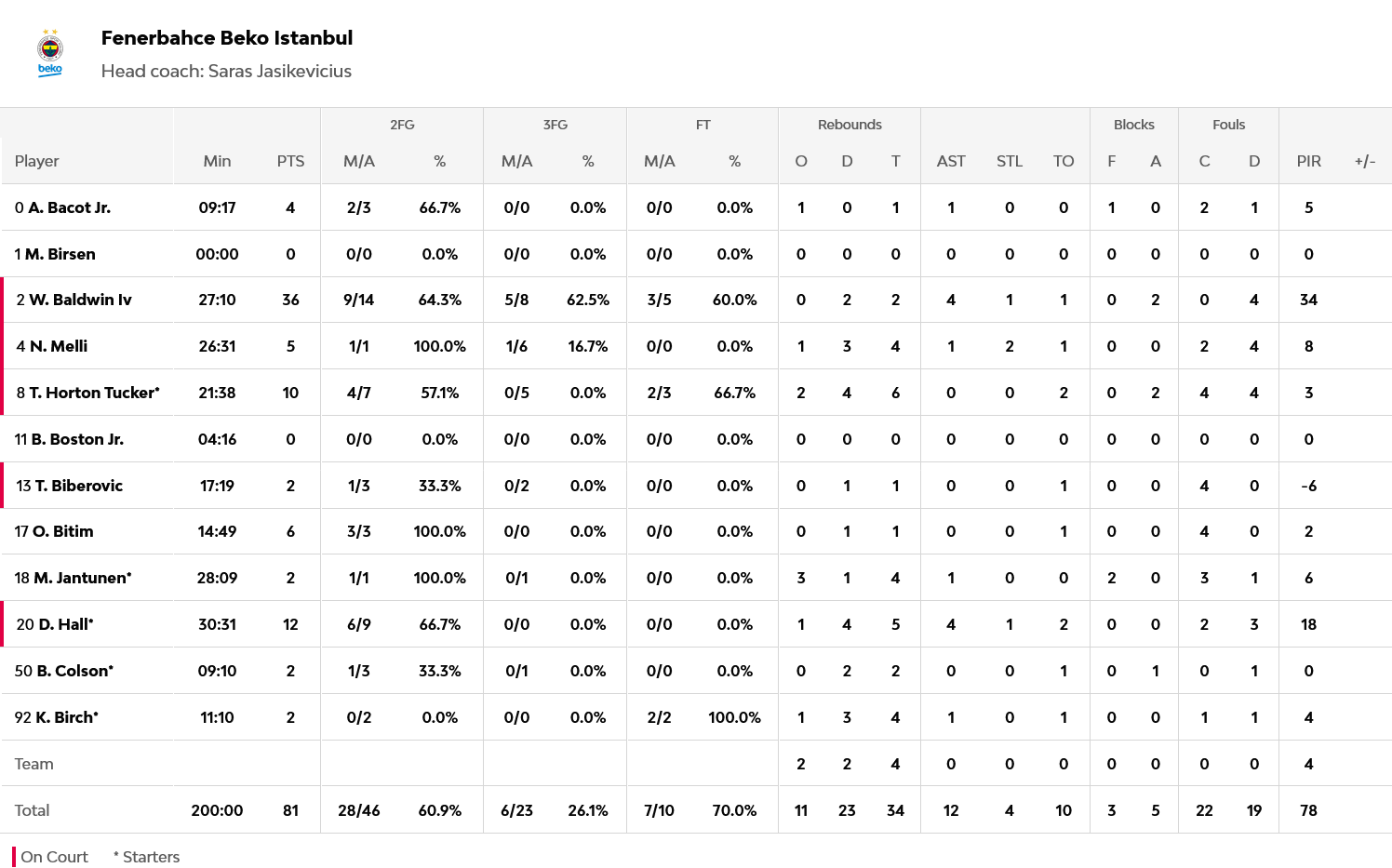 Ακόμα μία εξαιρετική εμφάνιση από τον Νάιτζελ Γουίλιαμς – Γκος με 20 πόντους, με τον Φρανσίσκο να έχει 18 και τον Μόουζες Ράιτ 11. Για την Φενέρ, ο συγκλονιστικός Μπάλντγουιν, με 36 πόντους και 5/8 τρίποντα, πήγε να γυρίσει μόνος του ένα παιχνίδι που έδειχνε χαμένο για τρία δεκάλεπτα.