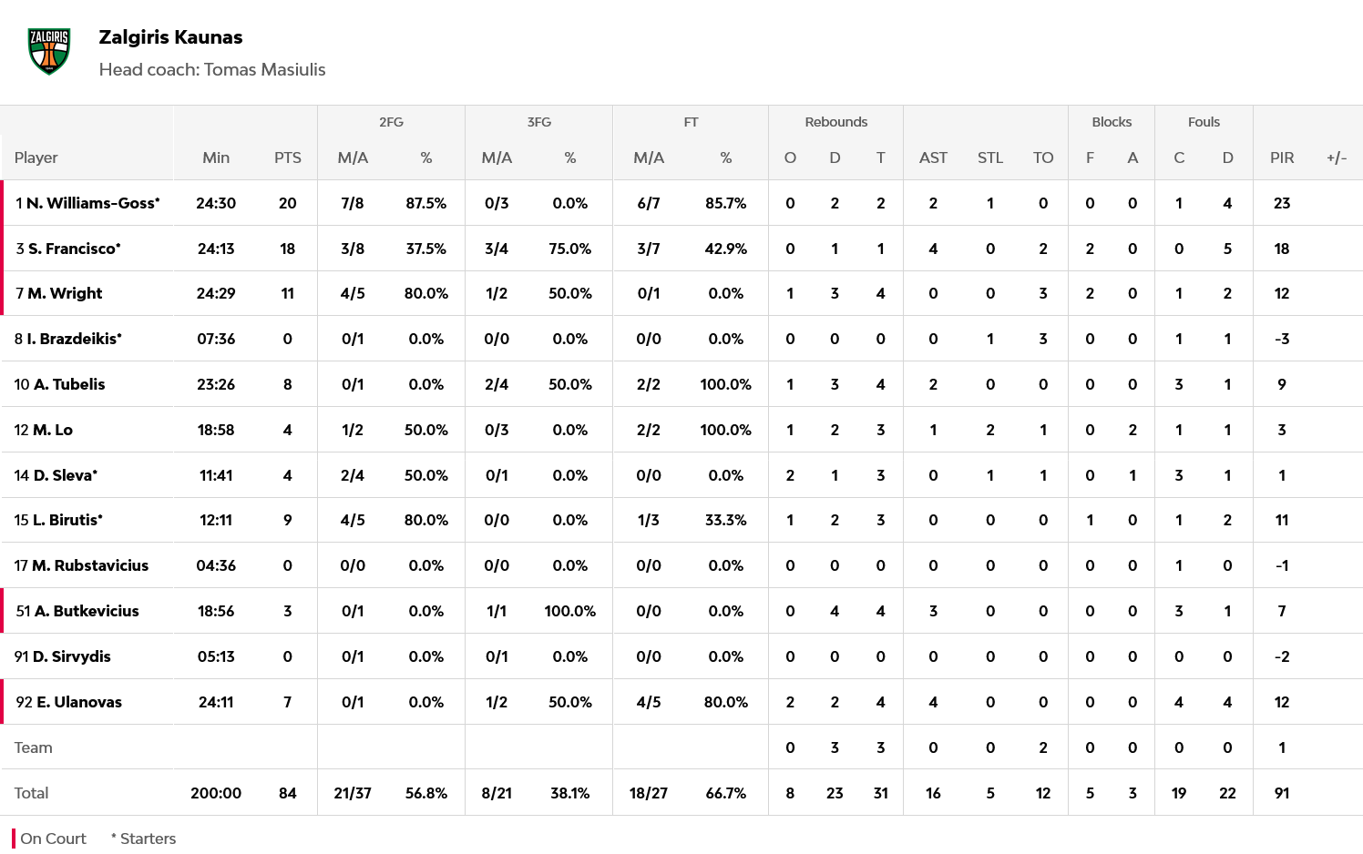 Ο Γουέιντ Μπάλντγουιν πραγματοποίησε μυθική εμφάνιση με 36 πόντους, ήταν ο κύριος υπαίτιος της επιστροφής των Τούρκων από το -14 του 29’ (65-51) στο +1 του 36’ (74-75), όμως όταν η μπάλα… έκαιγε, η Ζαλγκίρις βρήκε δύο τεράστια σουτ από τους Ουλανόβας και Μπουτκέβιτσους, με τους Λιθουανούς να ρίχνουν στο… καναβάτσο τους πρωταθλητές Ευρώπης και με το υπέρ τους 84-81, να κάνουν το 2Χ2.