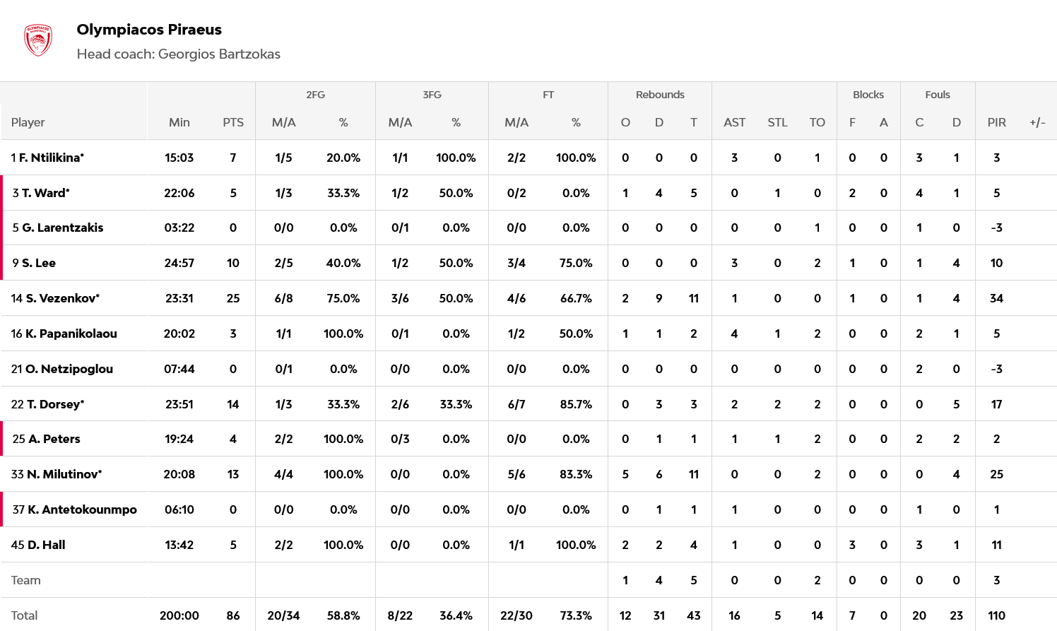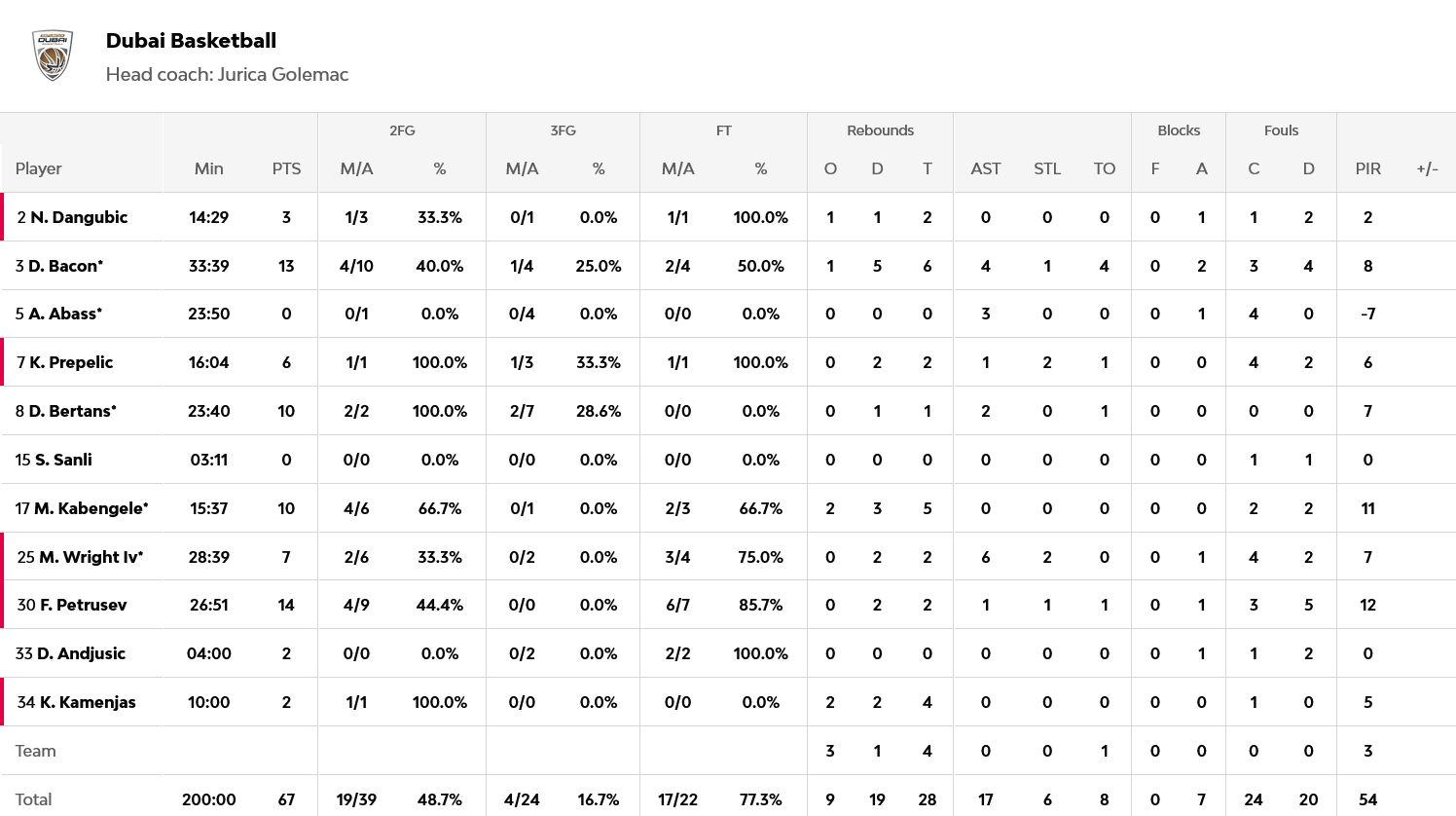 Ξεχώρισαν: Απολαυστικός ο Νίκολα Μιλουτίνοβ με 13 πόντους και 11 ριμπάουντ, με τους Ντόρσεϊ και Λι να έχουν 14 και 10 πόντους αντίστοιχα. Για τη Ντουμπάι, ο Πετρούσεβ είχε 14 πόντους, ο Μπέικον 13 και οι Καμπεγκέλε και Μπερτάνς από 10 έκαστος.