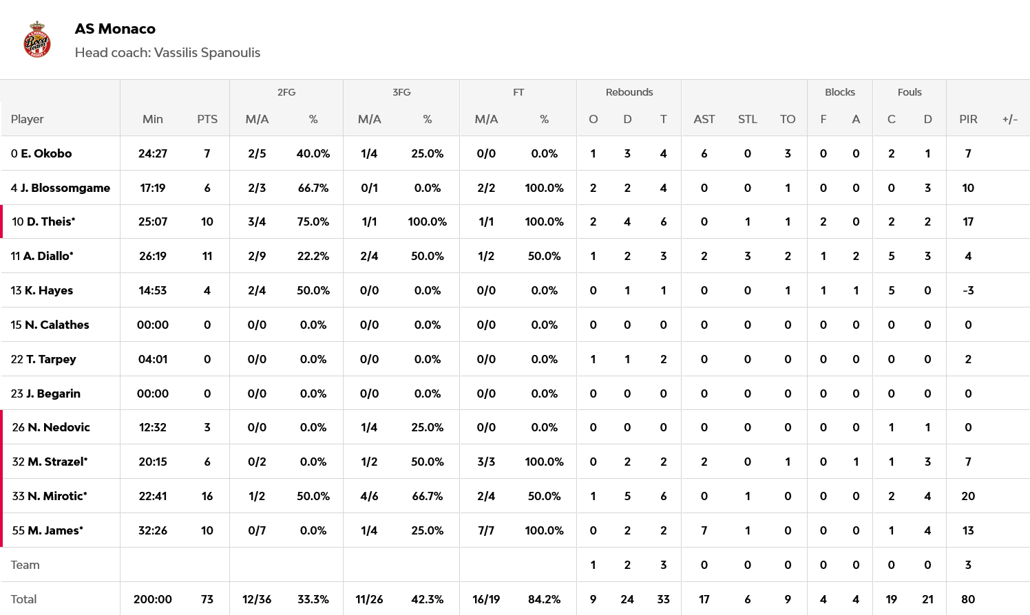 Εκπληκτικός ο Έντουαρντς με 24 πόντους, έξι ριμπάουντ και τέσσερις ασίστ, με τον Νιανγκ να βοηθά με 10 πόντους και έξι ριμπάουντ, ενώ για την Μονακό, ο Μίροτιτς είχε 16 πόντους και έξι ριμπάουντ, με τον Ντιάλο να προσθέτει 11.