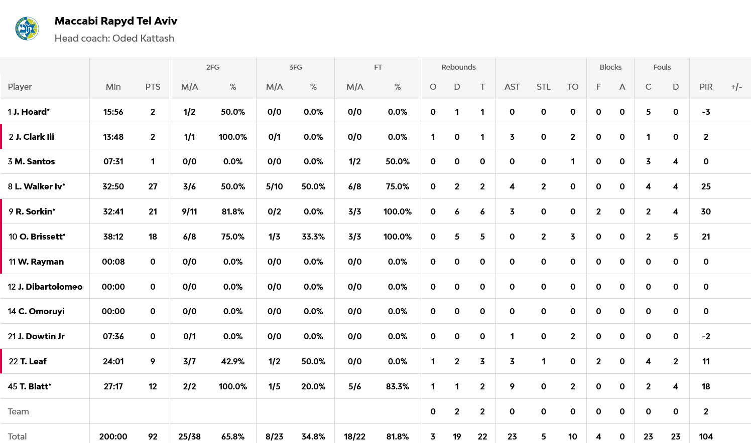 Ο Λόνι Γουόκερ με 27 πόντους, τους 20 στο β’ δεκάλεπτο και ο Σόρκιν με 21 πόντους, ήταν οι κορυφαίοι της Μακάμπι, που είχαν τον Μπρίσετ στους 18 και τον «clutch» Μπλατ στους 12 και με εννέα ασίστ.