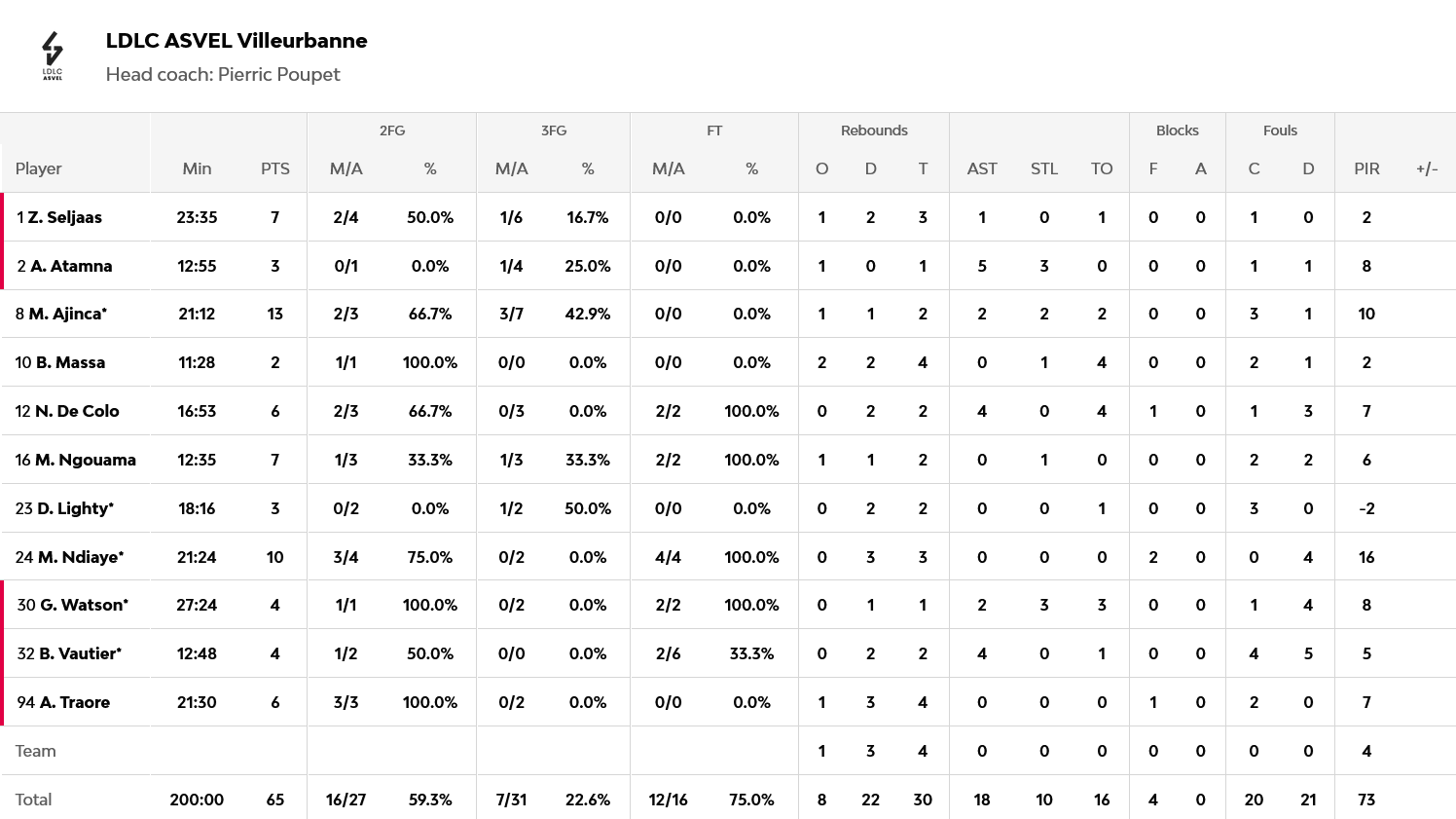 Απολαυστικός ο Μονέκε με 24 πόντους και επτά ριμπάουντ, με τους Ντόμπριτς και Οτζελέγιε να έχουν από 11 έκαστος. Για την Βιλερμπάν, ο Αγίνκα είχε 13 πόντους και ο Εντιαγέ 10.