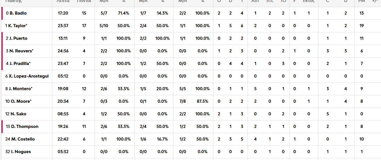 Κορυφαίος για τους γηπεδούχους ήταν ο Τέιλορ με 17 πόντους και 6 ριμπάουντ και ο Μπάντιο με 15 πόντους. Από την Φενέρ ξεχώρισε ο Μπιμπέροβιτς με 18 πόντους και οι Τάκερ και Μπάλντγουιν με 16 και 13 πόντους αντίστοιχα.