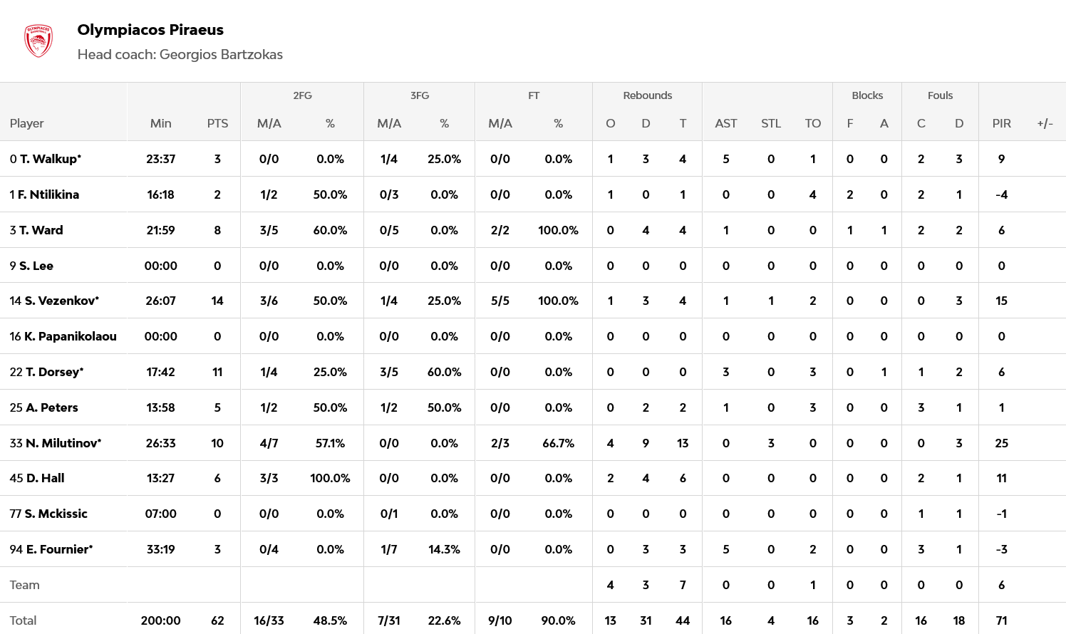 Ξεχώρισαν: Ο Βεζένκοβ με 14 πόντους ήταν ο πρώτος σκόρερ της αναμέτρησης, με τον Ντόρσεϊ να έχει 11. Για την Χάποελ, 13 πόντους πέτυχε ο Μπλέικνι και από 10 οι Μίτσιτς και Μάλκολμ.