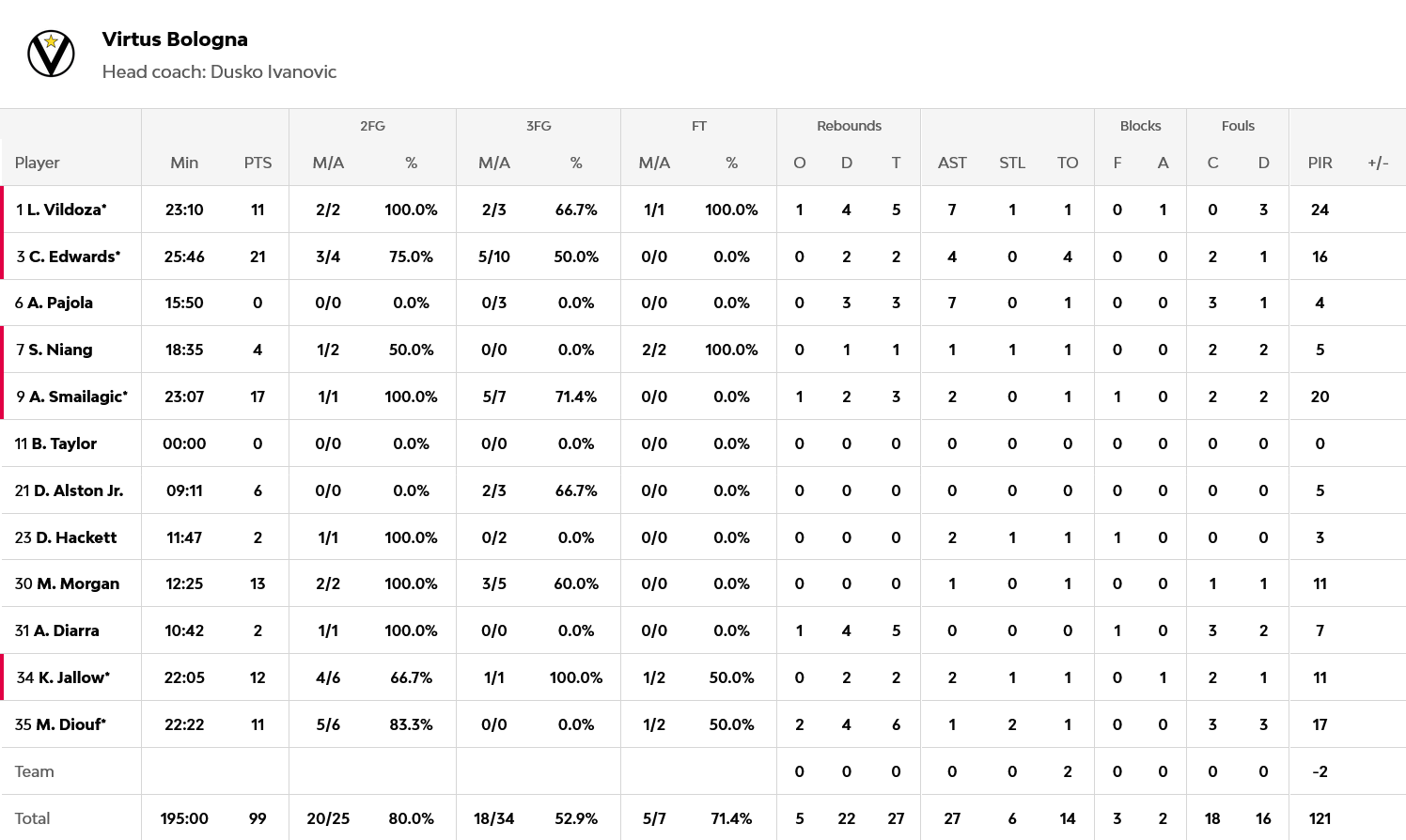 Έντουαρντς με 21 πόντους και Σμάιλαγκιτς με 17, ήταν οι κορυφαίοι για την Βίρτους, ενώ από πλευράς Αναντολού, ο Λάρκιν είχε 25 πόντους και ο Οσμάνι 16.