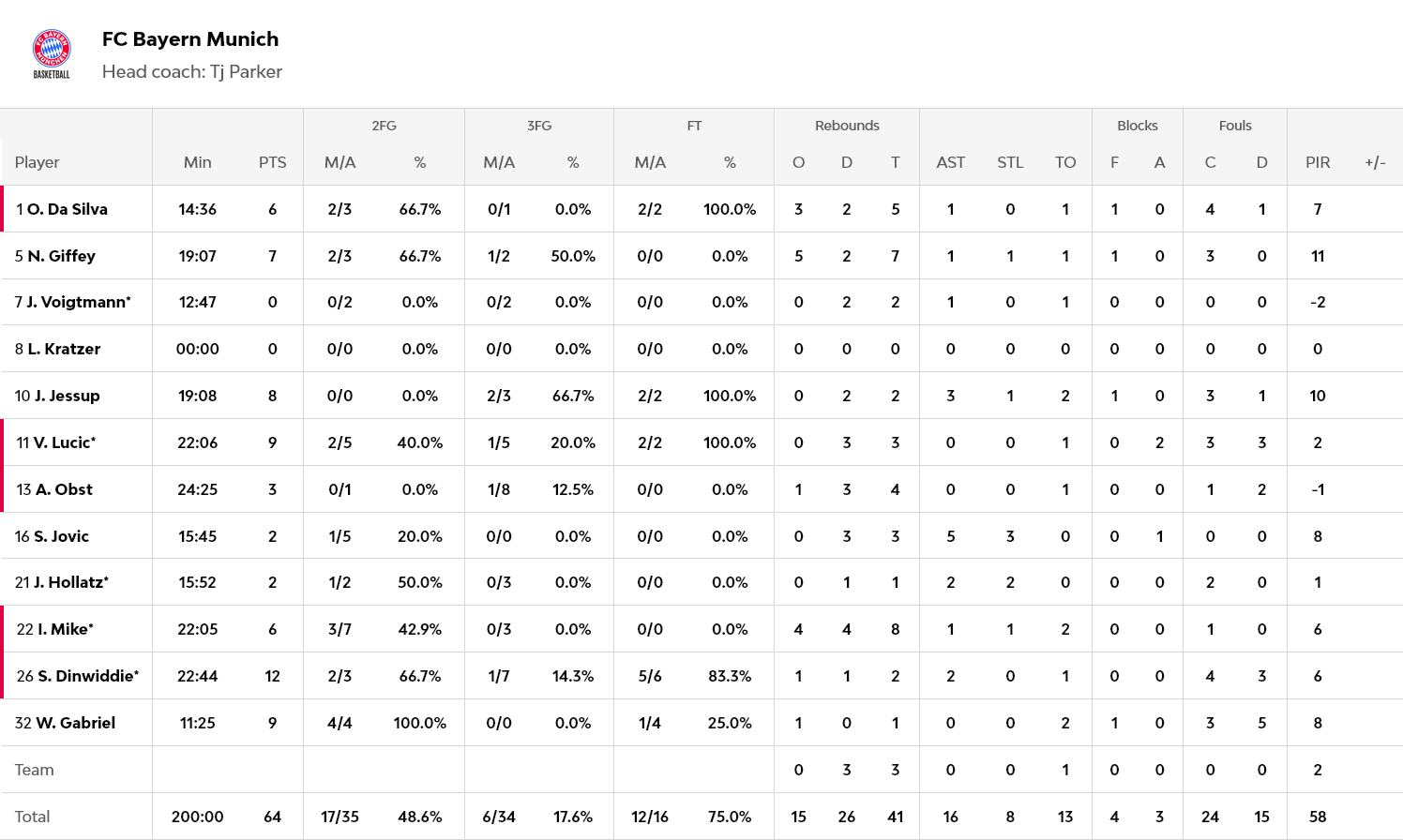 Πέντε παίκτες των Ισπανών τελείωσαν το ματς με διψήφιο αριθμό πόντων, με τον Μπαντιό να έχει 16 και τους Μοντέρο και Μουρ από 13. Για την Μπάγερν, ο Ντινγουίντι με 12 πόντους, ήταν ο μοναδικός διψήφιος.