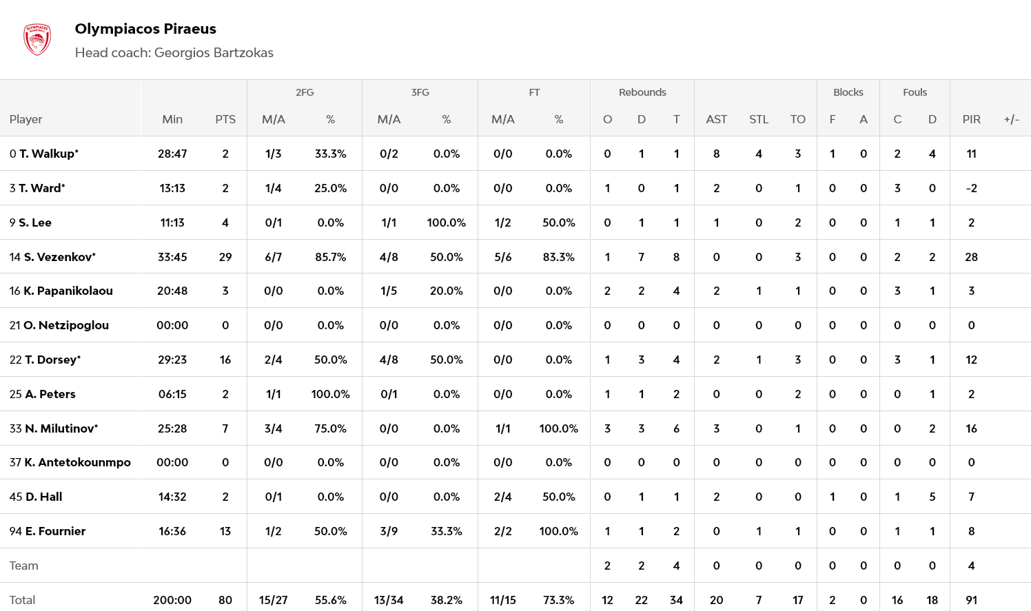 Ξεχώρισαν: Εξαιρετικός ο Νουόρα με 23 πόντους, με τον Οτζελέγε να προσθέτει 15, τον Μονέκε 11 και τον Μακϊντάιρ να… εκτελεί τους Πειραιώτες, με 10 πόντους, όλους στα τελευταία λεπτά. Για τον Ολυμπιακό, 16 πόντους σημείωσε ο Ντόρσεϊ και 13 ο Φουρνιέ