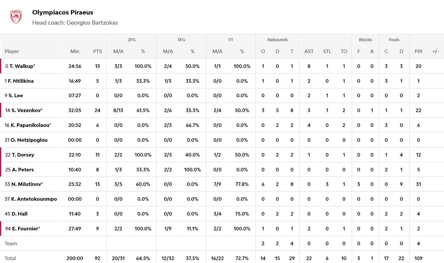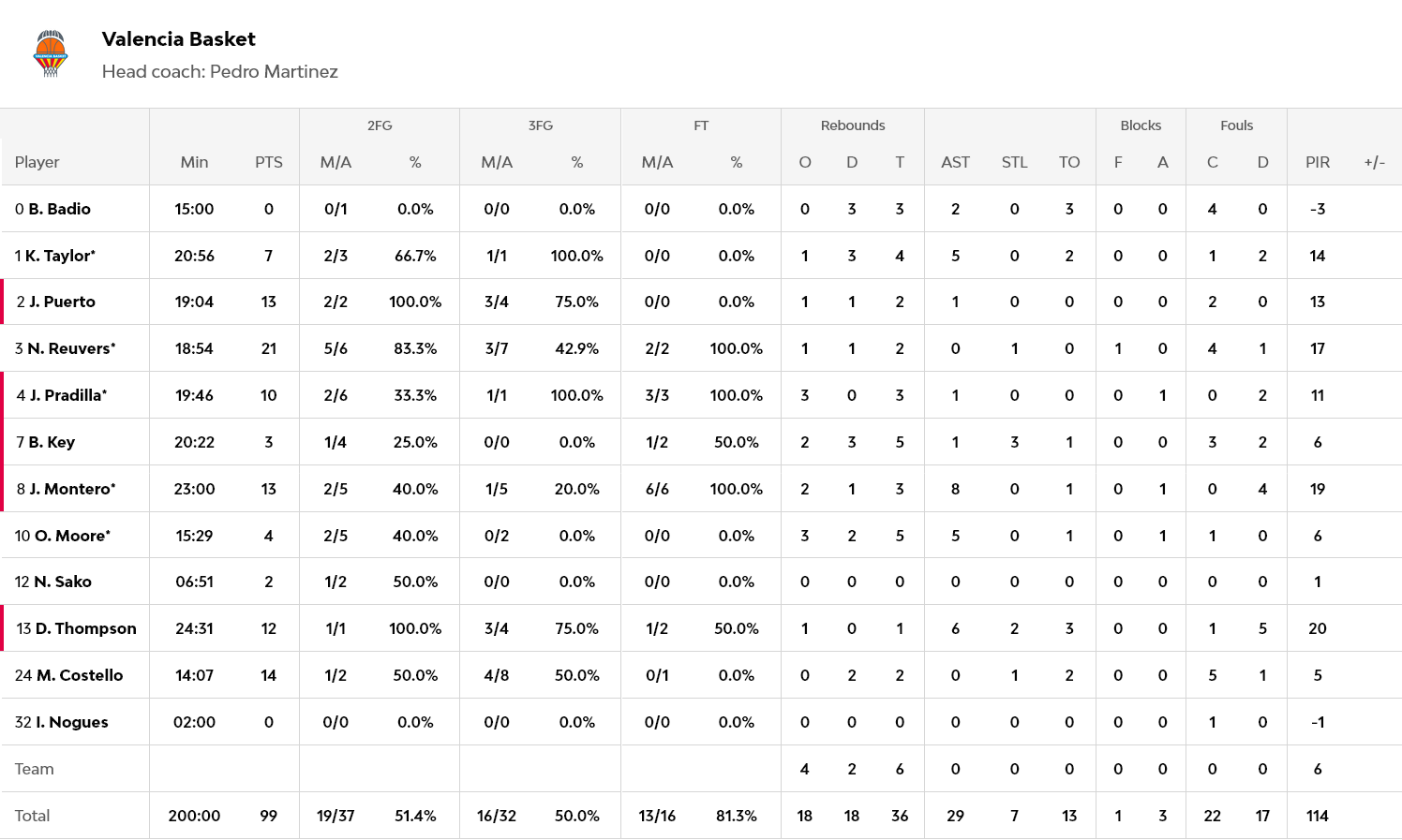 Ξεχώρισαν: Από 13 πόντους είχαν Γουόκαπ και Μιλουτίνοβ, με τον πρώτο να μοιράζει οκτώ ασίστ και τον δεύτερο να κατεβάζει οκτώ ριμπάουντ. Για την Βαλένθια των έξι διψήφιων, ο Ρίβερς είχε 21 πόντους.