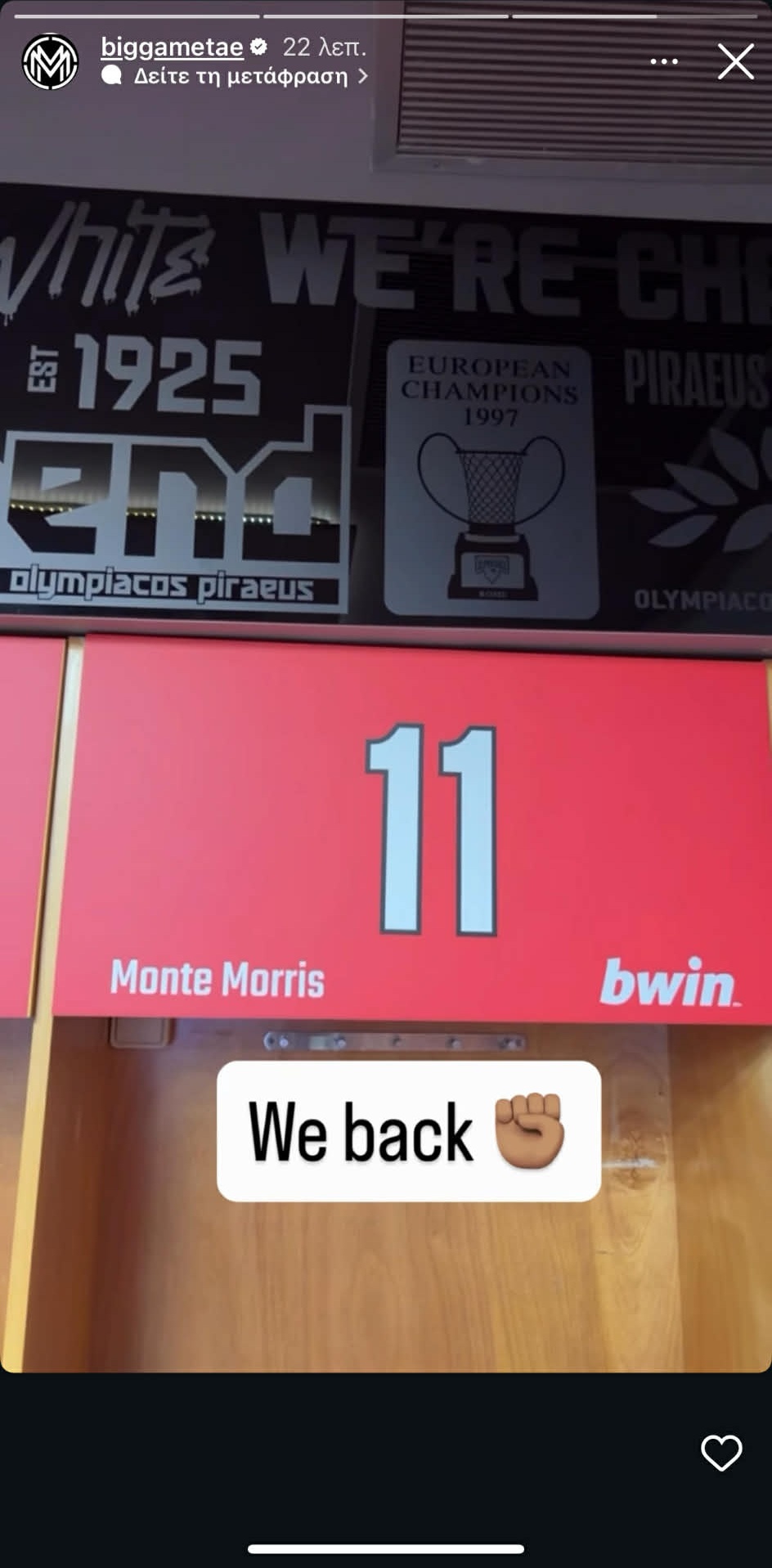 Ο Μόντε Μόρις δεν… κρατιέται να μπει στις αγωνιστικές υποχρεώσεις του Ολυμπιακού, με τον Αμερικανό γκαρντ να ανεβάζει story με το ντουλαπάκι του στα «ερυθρόλευκα» αποδυτήρια, αποκαλύπτοντας, παράλληλα, το νούμερο της φανέλας του.
