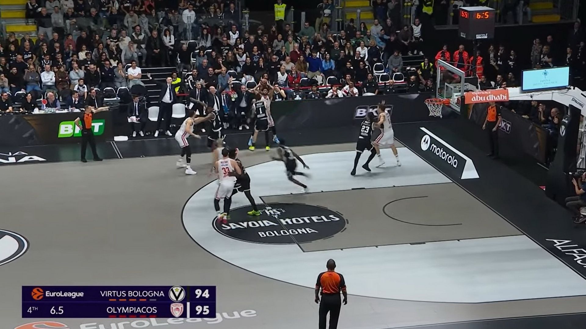 Ο Ολυμπιακός έφυγε νικητής από την Μπολόνια, απέναντι στην Βίρτους με 97-94, όμως πολύς ντόρος έγινε για την φάση στα 6,5’’ πριν το φινάλε, με τους Ιταλούς να διαμαρτύρονται για παράβαση 5’’, στην επαναφορά του Τάιλερ Ντόρσεϊ.