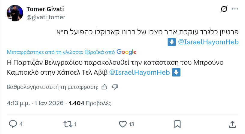 Στην πόρτα της εξόδου της Χάποελ Τελ Αβίβ βρίσκεται ο Μπρούνο Καμπόκλο, με την Παρτιζάν να… καραδοκεί, σε ένα ντόμινο εξελίξεων που επηρεάζει και την υπόθεση Ταϊρίκ Τζόουνς.