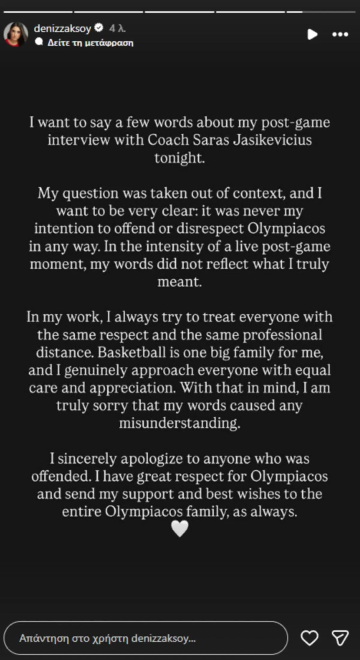 “Θέλω να πω μερικά πράγματα για τη συνέντευξη με τον Σαρούνας Γιασικεβίτσιους. Θέλω να είμαι ξεκάθαρη: Δεν είχα ποτέ πρόθεση να επιτεθώ στον Ολυμπιακό ή να τον προσβάλω, με οποιονδήποτε τρόπο. Στην ένταση μια ζωντανής στιγμής μετά από έναν αγώνα, τα λόγια μου δεν αντικατοπτρίζουν αυτό που πραγματικά εννοούσα.