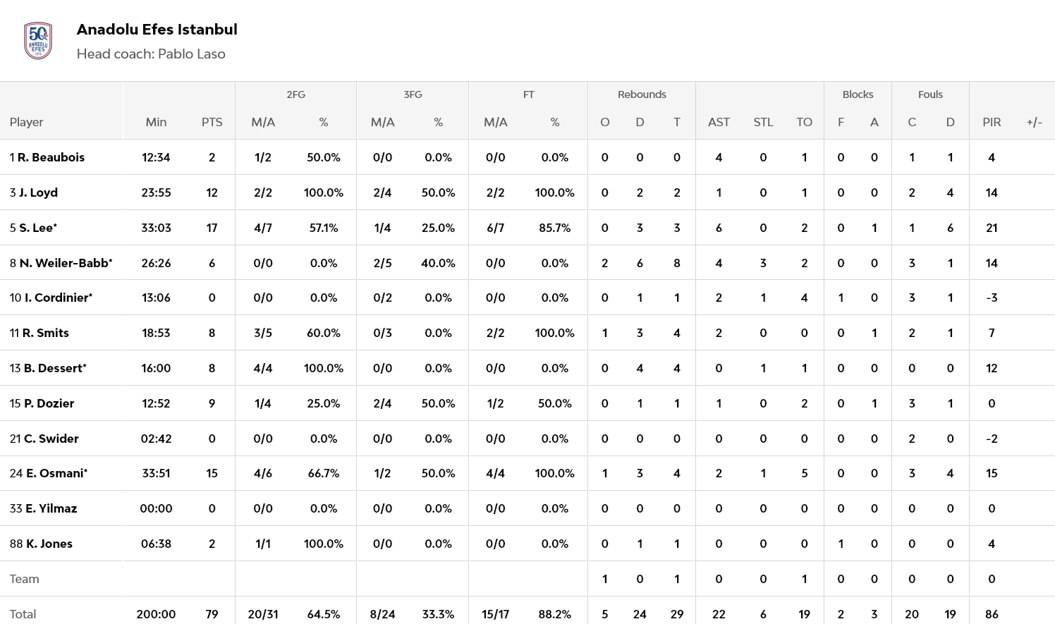 Από την Παρί διακρίθηκαν οι Χιφι και Ρόντεν με 27 και 15 πόντους αντίστοιχα. Από την Εφές ξεχώρισαν οι Λι και Οσμανί με 17 και 15 πόντους