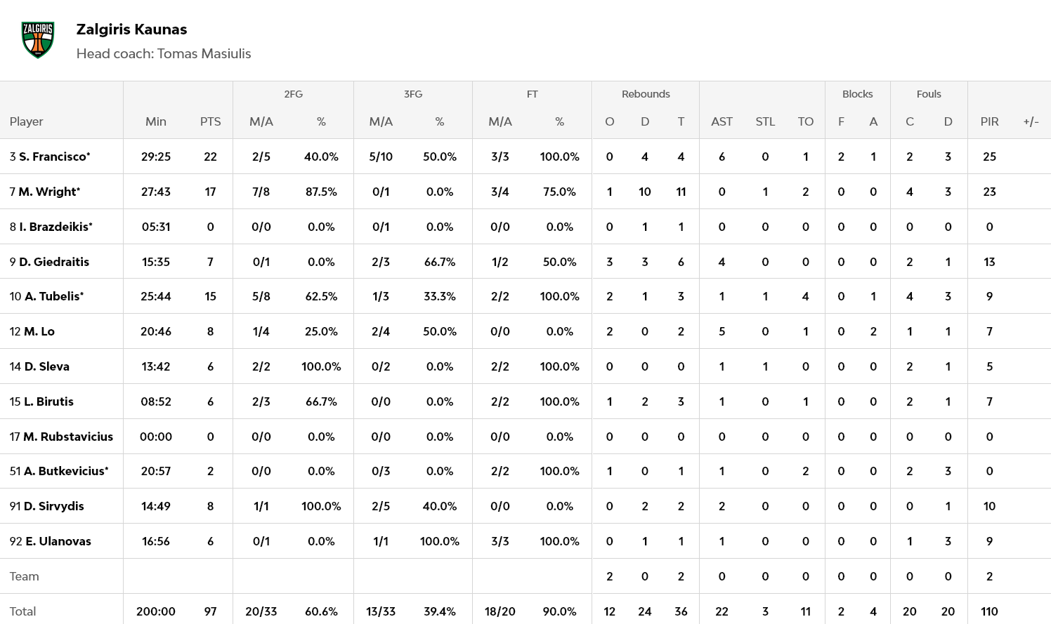 Κλαρκ, Σόρκιν και Λιφ είχαν από 17 πόντους για τους νικητές, ενώ για την Ζαλγκίρις, ο Φρανσίσκο είχε 22 πόντους, με τον Ράιτ να κάνει double – double με 17 πόντους και 11 ριμπάουντ.